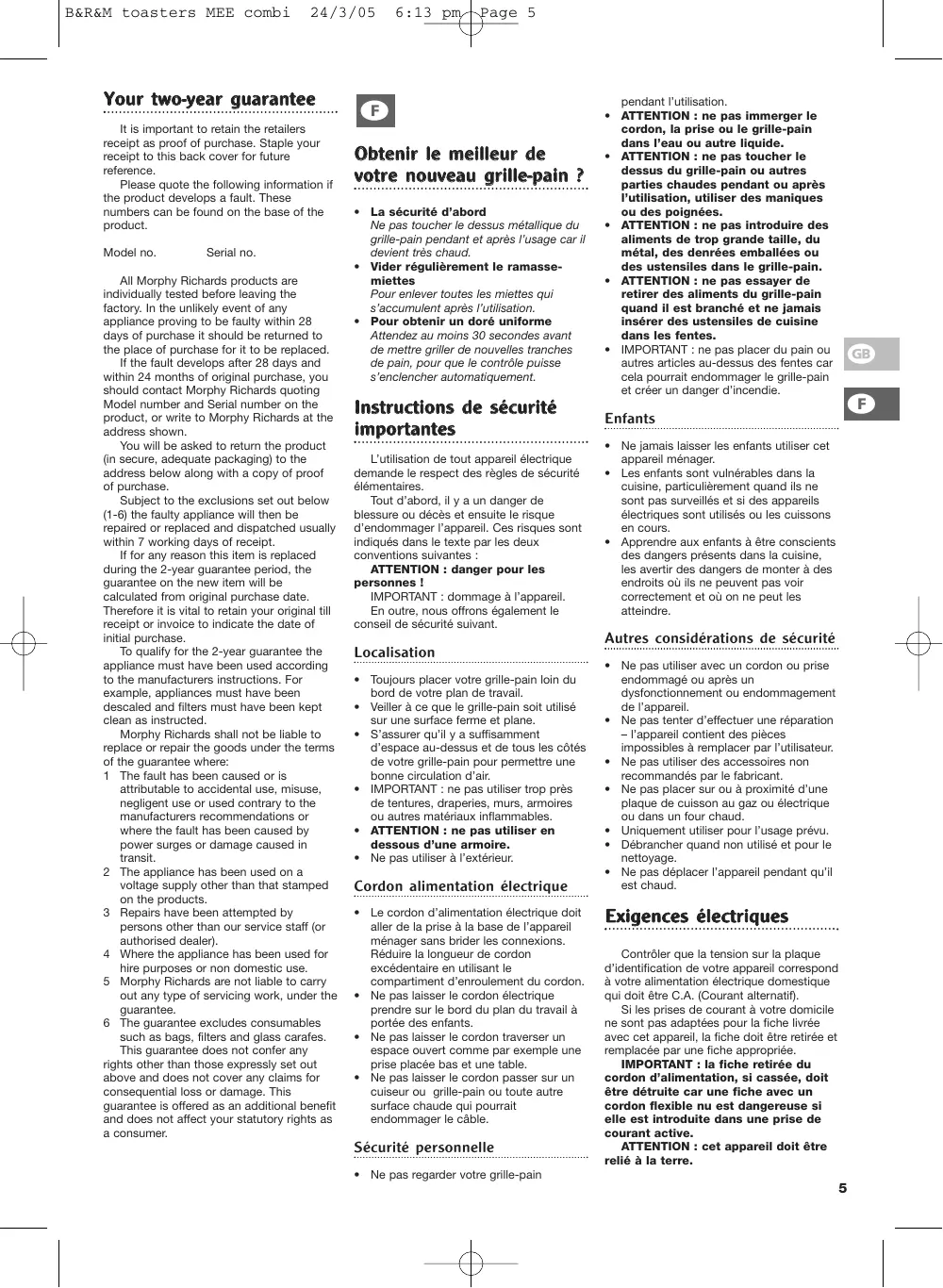 Les produits de Morphy Richards sont produits conformément les normes de qualité, agrée international. Au-dessus vos droits légaux, Morphy Richards vous garantit qu’à partir d’achat ce produit sera sans défauts de fabrication ou de matériels pendant une période de deux ans. Il est important de conserver votre bon d’achat comme preuve. Agrafez votre ticket à cette notice d’installation. Veuillez mentionner ces informations cidessous si votre appareil tombe en panne. Vous trouverez ces informations sur la base