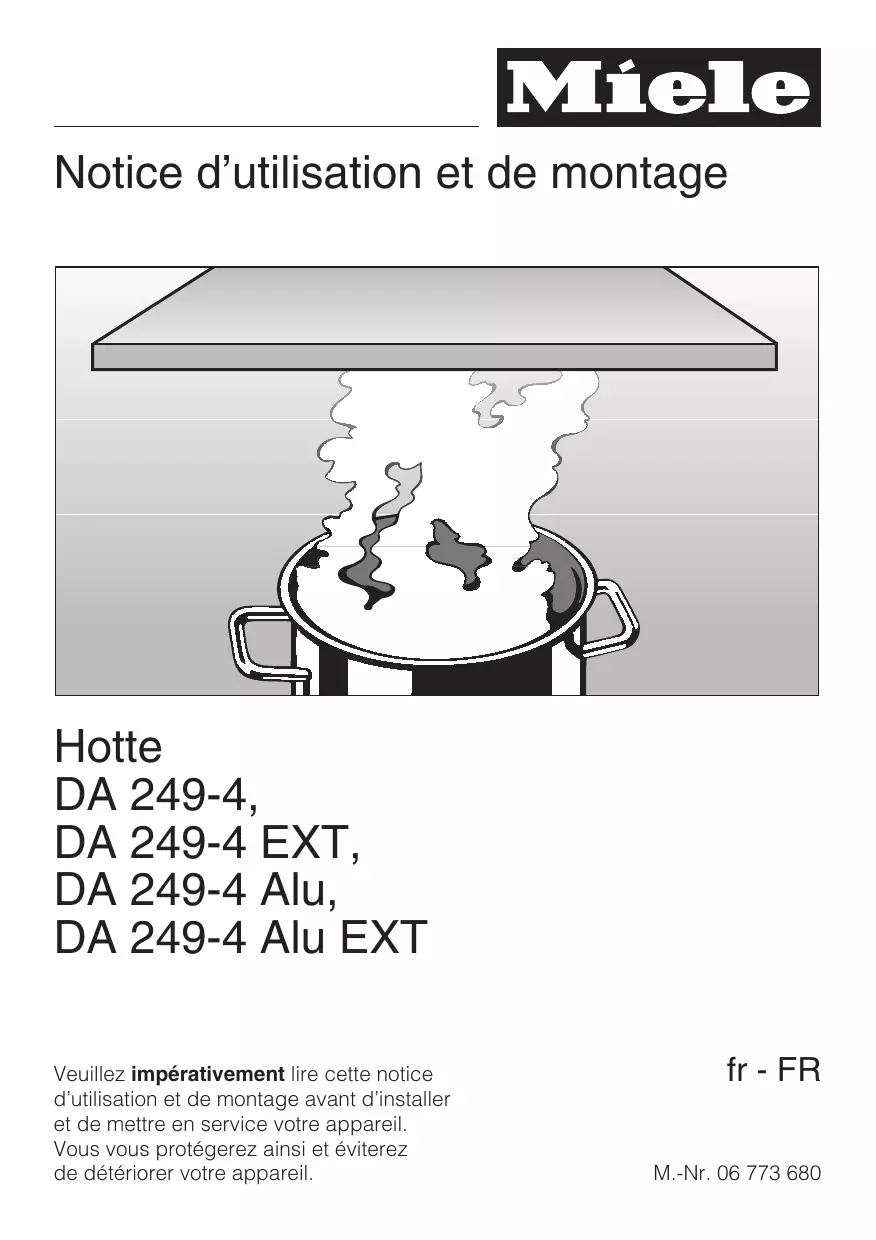 - Notice d’utilisation et de montage Hotte DA 249-4, DA 249-4 EXT, DA 249-4 Alu, DA 249-4 Alu EXT Veuillez impérativement lire cette notice d’utilisation et de montage avant d’installer et de mettre en service votre appareil. Vous vous protégerez ainsi et éviterez de détériorer votre appareil. fr - FR M.-Nr. 06 773 680 Table des matières Votre contribution à la protection de l’environnement p. 3