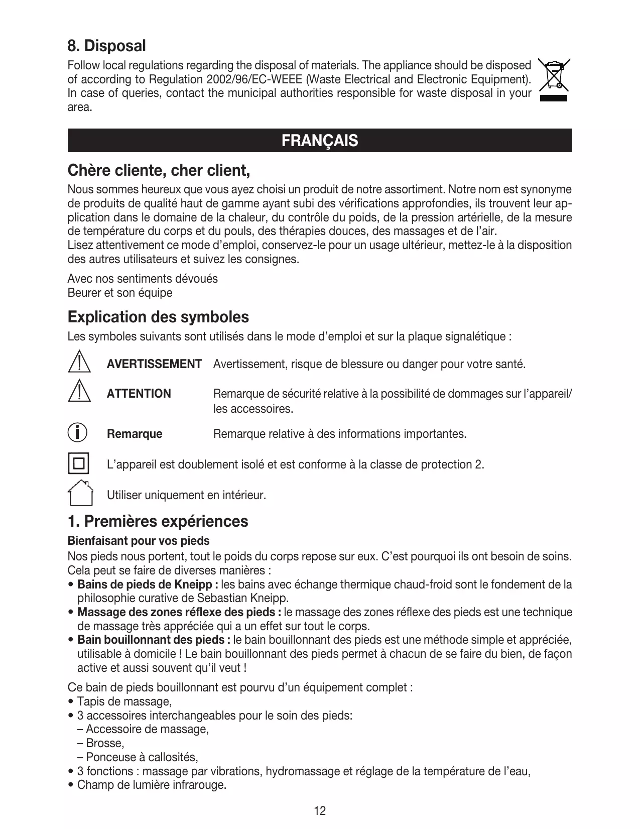 Follow local regulations regarding the disposal of materials. The appliance should be disposed of according to Regulation 2002/96/EC-WEEE (Waste Electrical and Electronic Equipment). In case of queries, contact the municipal authorities responsible for waste disposal in your area. Français Chère cliente, cher client, Nous sommes heureux que vous ayez choisi un produit de notre assortiment. Notre nom est synonyme de produits de qualité haut de gamme ayant subi des vérifications approfondies, ils trouvent leur application dans le domaine de la chaleur, du contrôle du poids, de la pression artérielle, de la mesure de température du corps et du pouls, des thérapies douces, des massages et de l’air. Lisez attentivement ce mode d’emploi, conservez-le pour un usage ultérieur, mettez-le à la disposition des autres utilisateurs et suivez les consignes. Avec nos sentiments dévoués Beurer et son équipe Explication des symboles Les symboles suivants sont utilisés dans le mode d’emploi et sur la plaque signalétique : AVERTISSEMENT Avertissement, risque de blessure ou danger pour votre santé. ATTENTION