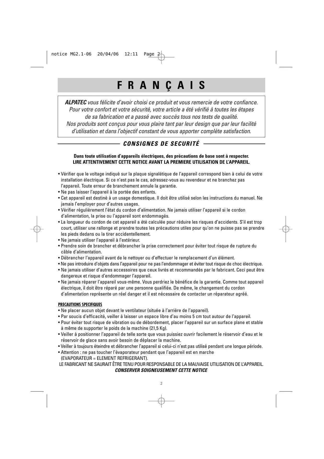 USER MANUAL notice MG2.1-06 20/04/06 12:11 Page 2 F R A N Ç A I S ALPATEC vous félicite d’avoir choisi ce produit et vous remercie de votre confiance. Pour votre confort et votre sécurité, votre article a été vérifié à toutes les étapes de sa fabrication et a passé avec succès tous nos tests de qualité. Nos produits sont conçus pour vous plaire tant par leur design que par leur facilité d’utilisation et dans l’objectif constant de vous apporter complète satisfaction.
