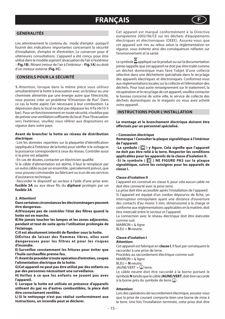 Lire attentivement le contenu du mode d’emploi puisqu’il fournit des indications importantes concernant la sécurité d’installation, d’emploi et d’entretien. Le conserver pour d’ ultérieures consultations. L’appareil a été conçu pour être utilisé dans le modèle aspirant (évacuation de l’air à l’extérieur – Fig.1B), filtrant (retour de l’air à l’intérieur – Fig.1A) ou doté d’un moteur externe (Fig.1C).