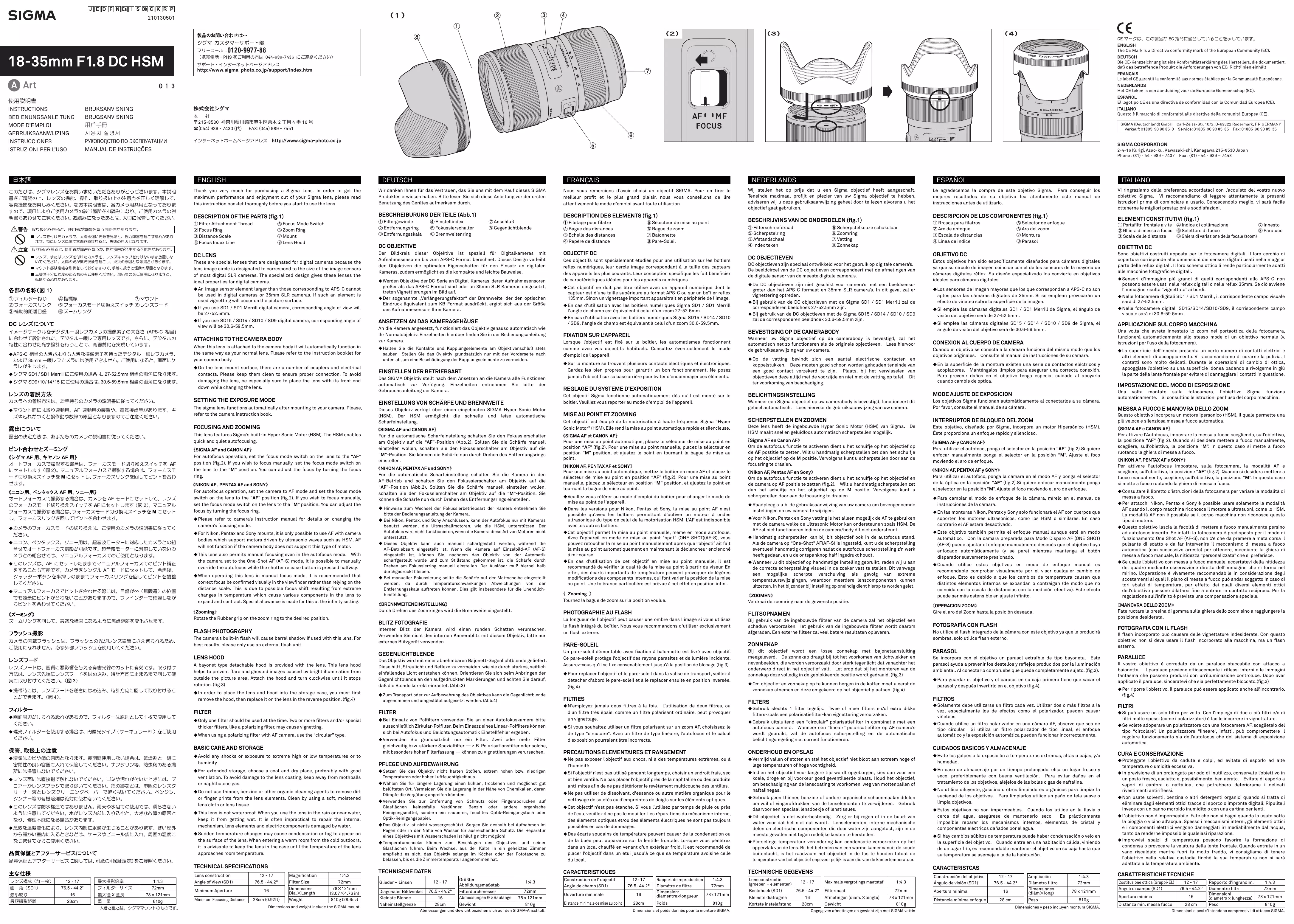 Dimensions Dia.gLength Weight 78g121mm (3.07g4.76 in) 810g (28.6oz) Minimum Focusing Distance 28cm (0.92ft) Dimensions and weight include the SIGMA mount. Temperaturen oder hoher Luftfeuchtigkeit aus. belüfteten Ort. Vermeiden Sie die Lagerung in der Nähe von Chemikalien, deren Dämpfe die Vergütung angreifen könnten. ŦVerwenden Sie zur Entfernung von Schmutz oder Fingerabdrücken auf Glasflächen keinesfalls Verdünner, Benzin oder andere organische Reinigungsmittel, sondern ein sauberes, feuchtes Optik-Reinigungstuch oder Optik-Reinigungspapier. ŦDas Objektiv ist nicht wassergeschützt. Sorgen Sie deshalb bei Aufnahmen im Regen oder in der Nähe von Wasser für ausreichenden Schutz. Die Reparatur eines Objektives mit Wasserschaden ist häufig nicht möglich! ŦTemperaturschocks können zum Beschlagen des Objektives und seiner Glasflächen führen. Beim Wechsel aus der Kälte in ein geheiztes Zimmer empfiehlt es sich, das Objektiv solange im Köcher oder der Fototasche zu belassen, bis es die Zimmertemperatur angenommen hat. TECHNISCHE DATEN Cet objectif est équipé de la motorisation à haute fréquence Sigma “Hyper Sonic Motor” (HSM). Elle rend la mise au point automatique rapide et silencieuse. 䇶SIGMA AF et CANON AF䇷 Pour une mise au point automatique, placez le sélecteur de mise au point en position “AF” (fig.2). Pour une mise au point manuelle, placez le sélecteur en position “M” position, et ajustez le point en tournant la bague de mise au point. 䇶NIKON AF, PENTAX AF et SONY䇷 Pour une mise au point automatique, mettez le boîtier en mode AF et placez le sélecteur de mise au point en position “AF” (fig.2). Pour une mise au point manuelle, placez le sélecteur en position “M” position, et ajustez le point en tournant la bague de mise au point. Veuillez vous référer au mode d'emploi du boîtier pour changer le mode de mise au point de l'appareil. Dans les versions pour Nikon, Pentax et Sony, la mise au point AF n'est possible qu'avec les boîtiers permettant d'activer un moteur à ondes ultrasonique du type de celui de la motorisation HSM. L'AF est indisponible avec les autres boîtiers. Cet objectif permet la mise au point manuelle, même en mode autofocus. Avec l’appareil en mode de mise au point "spot" (ONE SHOT)(AF-S), vous pouvez retoucher la mise au point manuellement après que l’objectif ait fait la mise au point automatiquement en maintenant le déclencheur enclenché à mi-course. En cas d’utilisation de cet objectif en mise au point manuelle, il est recommandé de vérifier la qualité de la mise au point à partir du viseur. En effet, des écarts importants de température peuvent provoquer de légères modifications des composants intemes, qui font varier la position de la mise au point. Une tolérance particulière est prévue à cet effet en position infini. 䇶㩷 Zooming 䇷 Tournez la bague de zoom sur la position voulue. Diagonaler Bildwinkel Kleinste Blende Naheinstellgrenze