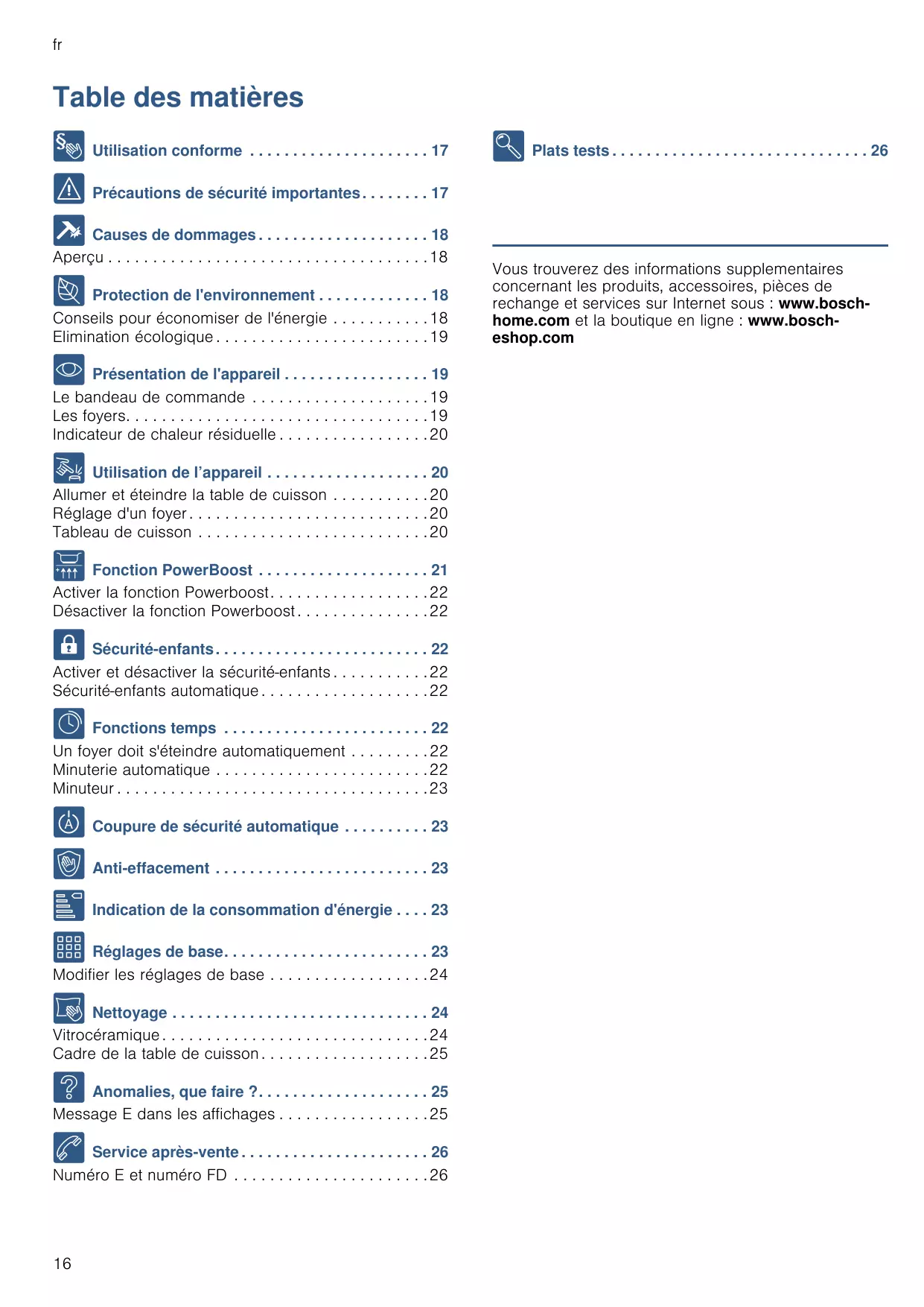 Vous trouvrez des informations supplémentaires concernant les produits, accessoires, pièces de rechange et services sur Internet sous : www.bosch-home.com et la boutique en ligne : www.boscheshop.com