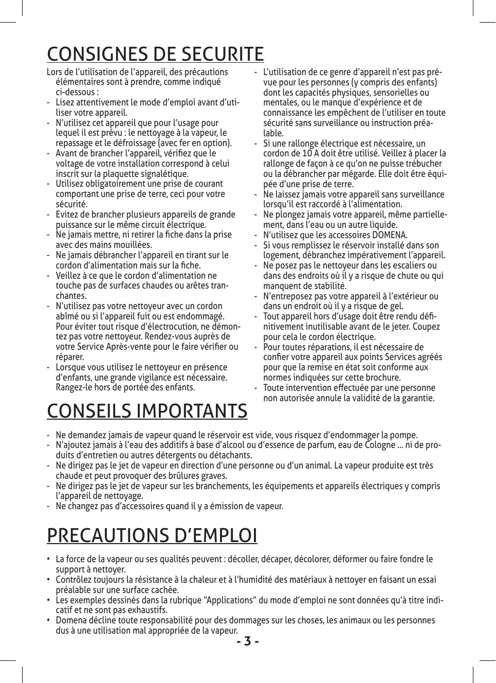 - Domena décline toute responsabilité pour des dommages sur les choses, les animaux ou les personnes dus à une utilisation mal appropriée de la vapeur.