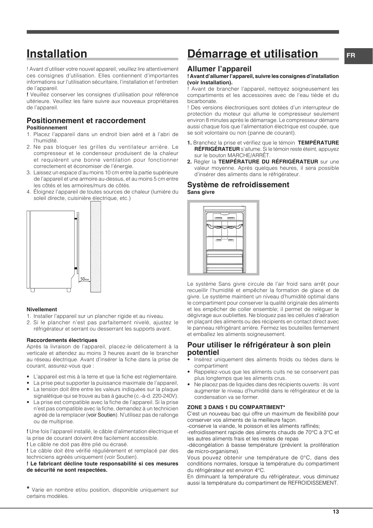! Avant d’allumer l’appareil, suivre les consignes d’installation (voir Installation). ! Avant de brancher l’appareil, nettoyez soigneusement les compartiments et les accessoires avec de l’eau tiède et du bicarbonate. ! Des versions électroniques sont dotées d’un interrupteur de protection du moteur qui allume le compresseur seulement environ 8 minutes après le démarrage. Le compresseur démarre aussi chaque fois que l’alimentation électrique est coupée, que se soit volontaire ou non (panne de courant).