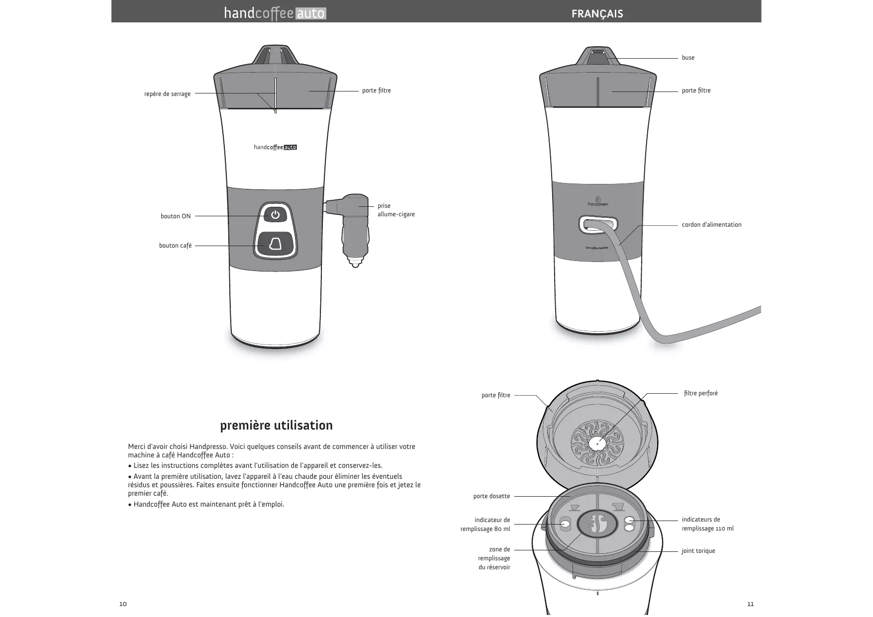 FRANÇAIS buse porte filtre porte filtre repère de serrage prise allume-cigare bouton ON cordon d’alimentation bouton café porte filtre filtre perforé première utilisation Merci d’avoir choisi Handpresso. Voici quelques conseils avant de commencer à utiliser votre machine à café Handcoffee Auto :