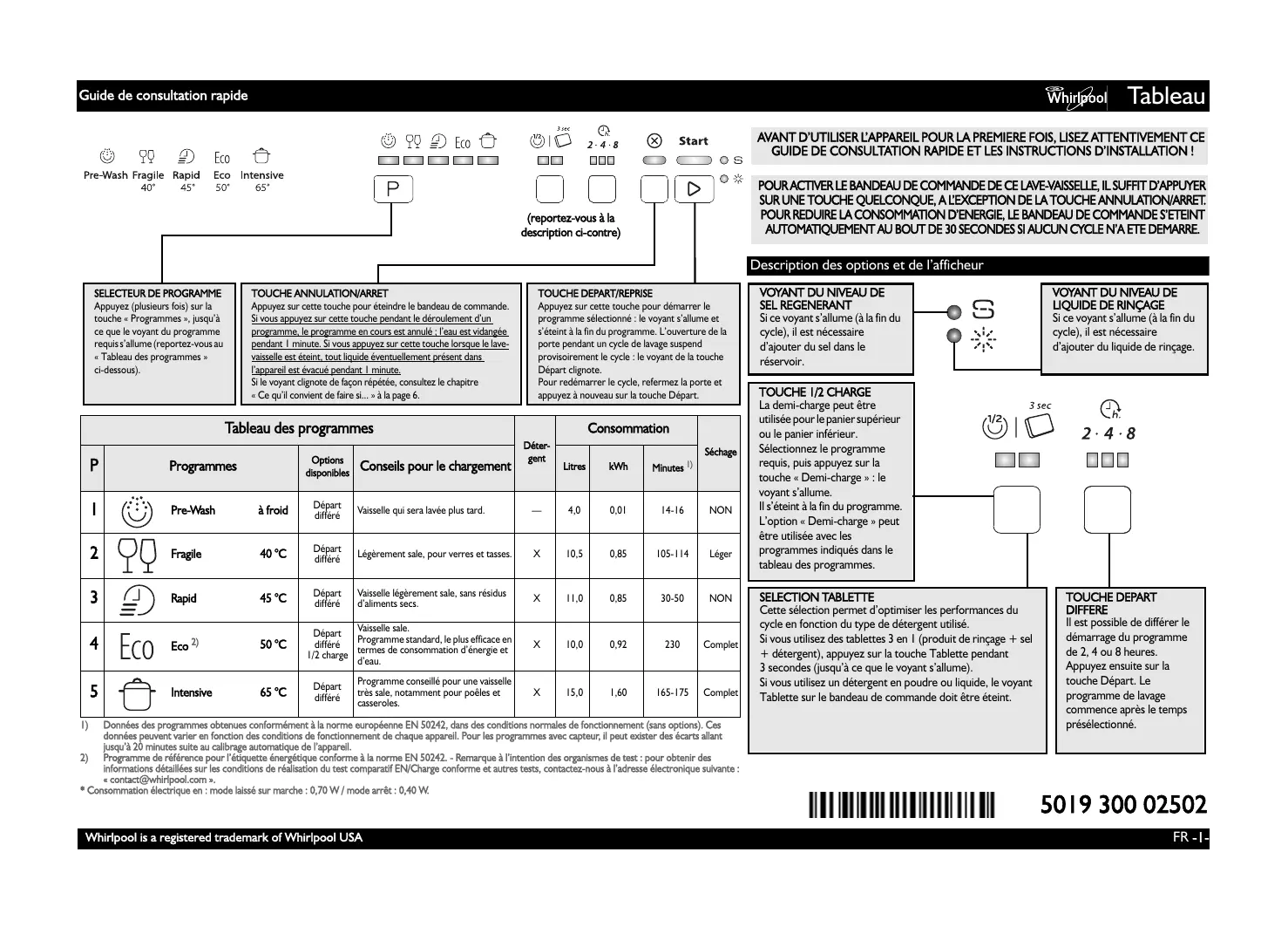 Données des programmes obtenues conformément à la norme européenne EN 50242, dans des conditions normales de fonctionnement (sans options). Ces données peuvent varier en fonction des conditions de fonctionnement de chaque appareil. Pour les programmes avec capteur, il peut exister des écarts allant jusqu’à 20 minutes suite au calibrage automatique de l’appareil. 2) Programme de référence pour l’étiquette énergétique conforme à la norme EN 50242. - Remarque à l’intention des organismes de test : pour obtenir des informations détaillées sur les conditions de réalisation du test comparatif EN/Charge conforme et autres tests, contactez-nous à l’adresse électronique suivante : « contact@whirlpool.com ».