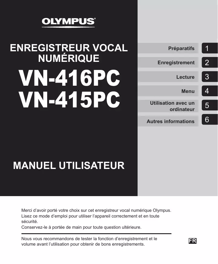 Téléchargez la notice de votre Enregistreur vocal au format PDF gratuitement ! Retrouvez votre notice VN-415 - OLYMPUS et reprennez votre appareil électronique en main. Sur cette page sont publiés tous les documents nécessaires à l'utilisation de votre appareil VN-415 de la marque OLYMPUS.