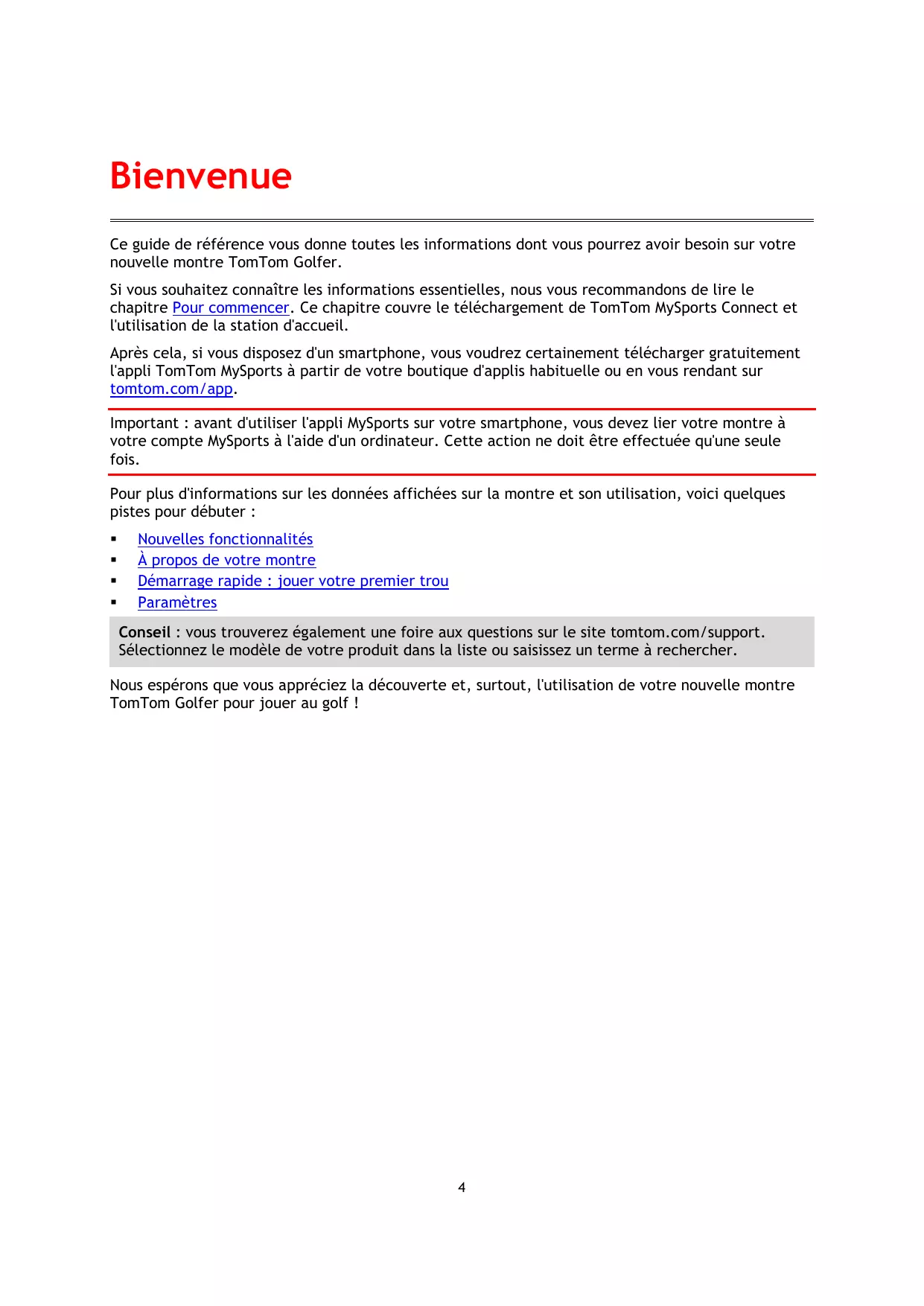 Bienvenue Ce guide de référence vous donne toutes les informations dont vous pourrez avoir besoin sur votre nouvelle montre TomTom Golfer. Si vous souhaitez connaître les informations essentielles, nous vous recommandons de lire le chapitre Pour commencer. Ce chapitre couvre le téléchargement de TomTom MySports Connect et l'utilisation de la station d'accueil. Après cela, si vous disposez d'un smartphone, vous voudrez certainement télécharger gratuitement l'appli TomTom MySports à partir de votre boutique d'applis habituelle ou en vous rendant sur tomtom.com/app. Important : avant d'utiliser l'appli MySports sur votre smartphone, vous devez lier votre montre à votre compte MySports à l'aide d'un ordinateur. Cette action ne doit être effectuée qu'une seule fois. Pour plus d'informations sur les données affichées sur la montre et son utilisation, voici quelques pistes pour débuter :