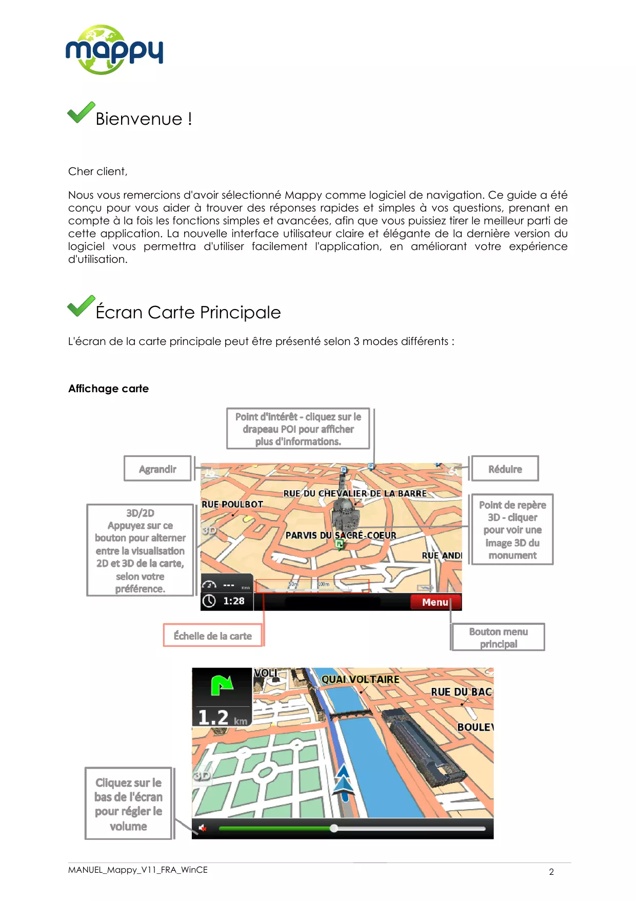 Bienvenue ! Cher client, Nous vous remercions d'avoir sélectionné Mappy comme logiciel de navigation. Ce guide a été conçu pour vous aider à trouver des réponses rapides et simples à vos questions, prenant en compte à la fois les fonctions simples et avancées, afin que vous puissiez tirer le meilleur parti de cette application. La nouvelle interface utilisateur claire et élégante de la dernière version du logiciel vous permettra d'utiliser facilement l'application, en améliorant votre expérience d'utilisation. Écran Carte Principale L'écran de la carte principale peut être présenté selon 3 modes différents : Affichage carte MANUEL_Mappy_V11_FRA_WinCE