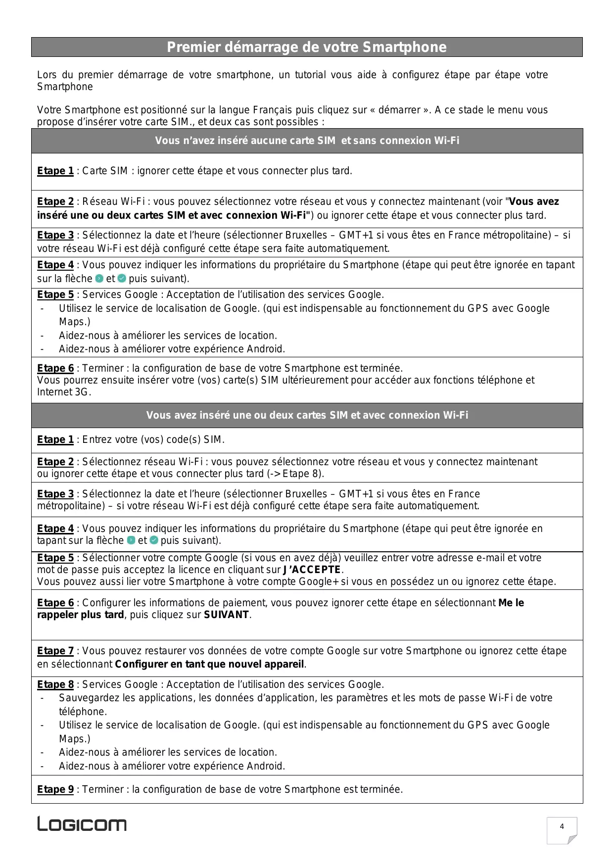Premier démarrage de votre Smartphone Lors du premier démarrage de votre smartphone, un tutorial vous aide à configurez étape par étape votre Smartphone Votre Smartphone est positionné sur la langue Français puis cliquez sur « démarrer ». A ce stade le menu vous propose d’insérer votre carte SIM., et deux cas sont possibles : Vous n’avez inséré aucune carte SIM et sans connexion Wi-Fi Etape 1 : Carte SIM : ignorer cette étape et vous connecter plus tard. Etape 2 : Réseau Wi-Fi : vous pouvez sélectionnez votre réseau et vous y connectez maintenant (voir "Vous avez inséré une ou deux cartes SIM et avec connexion Wi-Fi") ou ignorer cette étape et vous connecter plus tard. Etape 3 : Sélectionnez la date et l’heure (sélectionner Bruxelles – GMT+1 si vous êtes en France métropolitaine) – si votre réseau Wi-Fi est déjà configuré cette étape sera faite automatiquement. Etape 4 : Vous pouvez indiquer les informations du propriétaire du Smartphone (étape qui peut être ignorée en tapant sur la flèche et puis suivant). Etape 5 : Services Google : Acceptation de l’utilisation des services Google. - Utilisez le service de localisation de Google. (qui est indispensable au fonctionnement du GPS avec Google Maps.) - Aidez-nous à améliorer les services de location. - Aidez-nous à améliorer votre expérience Android. Etape 6 : Terminer : la configuration de base de votre Smartphone est terminée. Vous pourrez ensuite insérer votre (vos) carte(s) SIM ultérieurement pour accéder aux fonctions téléphone et Internet 3G. Vous avez inséré une ou deux cartes SIM et avec connexion Wi-Fi Etape 1 : Entrez votre (vos) code(s) SIM. Etape 2 : Sélectionnez réseau Wi-Fi : vous pouvez sélectionnez votre réseau et vous y connectez maintenant ou ignorer cette étape et vous connecter plus tard (-> Etape 8). Etape 3 : Sélectionnez la date et l’heure (sélectionner Bruxelles – GMT+1 si vous êtes en France métropolitaine) – si votre réseau Wi-Fi est déjà configuré cette étape sera faite automatiquement. Etape 4 : Vous pouvez indiquer les informations du propriétaire du Smartphone (étape qui peut être ignorée en tapant sur la flèche et puis suivant). Etape 5 : Sélectionner votre compte Google (si vous en avez déjà) veuillez entrer votre adresse e-mail et votre mot de passe puis acceptez la licence en cliquant sur J’ACCEPTE. Vous pouvez aussi lier votre Smartphone à votre compte Google+ si vous en possédez un ou ignorez cette étape. Etape 6 : Configurer les informations de paiement, vous pouvez ignorer cette étape en sélectionnant Me le rappeler plus tard, puis cliquez sur SUIVANT.