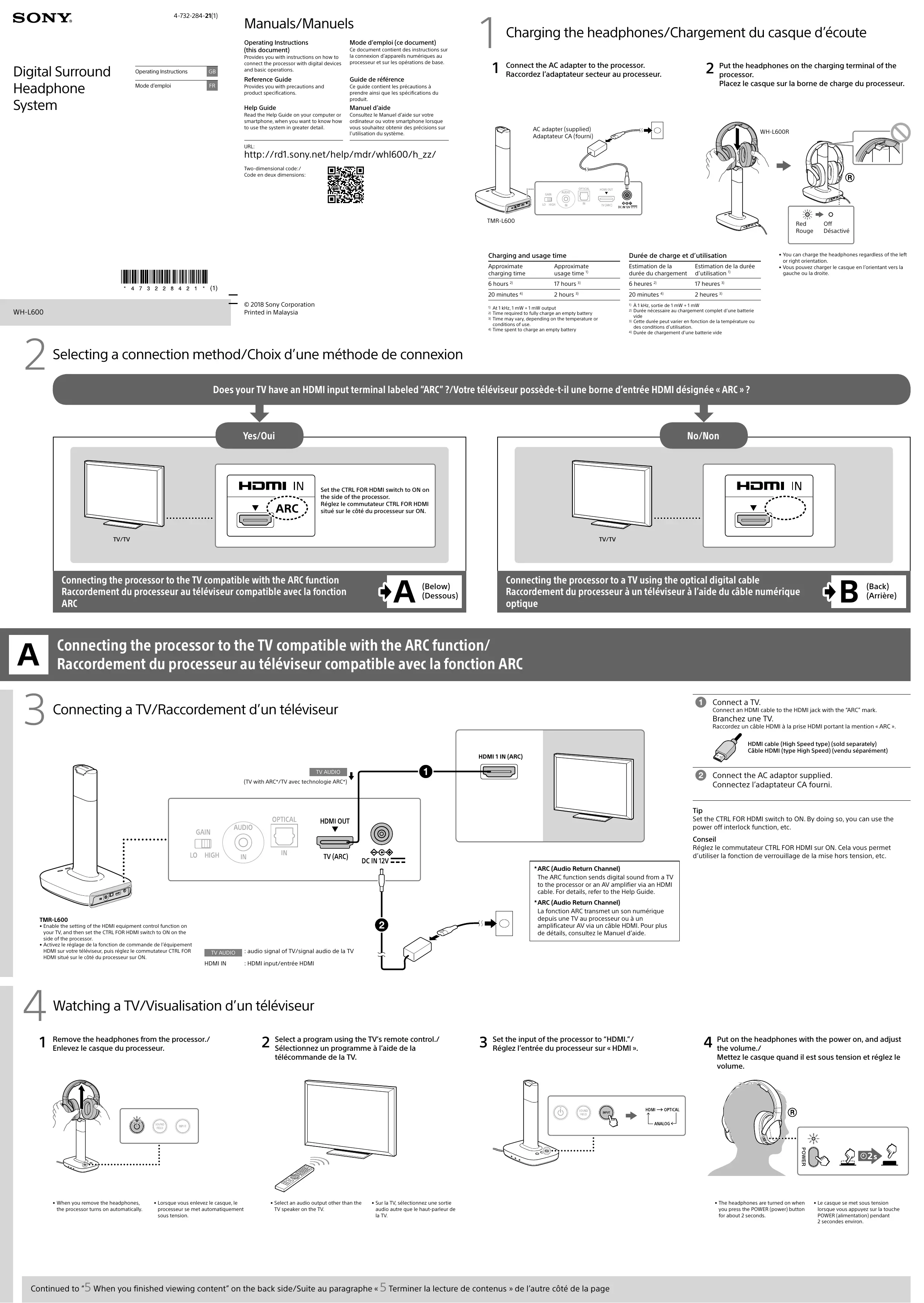 - Vous pouvez charger le casque en l’orientant vers la gauche ou la droite. À 1 kHz, sortie de 1 mW + 1 mW Durée nécessaire au chargement complet d’une batterie vide Cette durée peut varier en fonction de la température ou des conditions d’utilisation. Durée de chargement d’une batterie vide Selecting a connection method/Choix d’une méthode de connexion Does your TV have an HDMI input terminal labeled “ARC” ?/Votre téléviseur possède-t-il une borne d’entrée HDMI désignée « ARC » ? Yes/Oui No/Non Set the CTRL FOR HDMI switch to ON on the side of the processor. Réglez le commutateur CTRL FOR HDMI situé sur le côté du processeur sur ON. TV/TV TV/TV