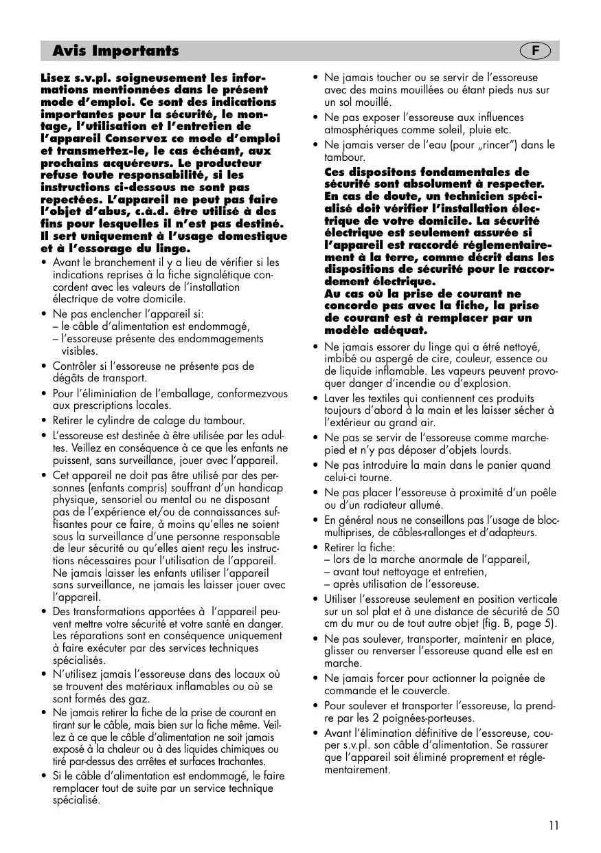 Lisez s.v.pl. soigneusement les informations mentionnées dans le present mode d'emploi. Ce sont des indications importantes pour la sécurité, le montage, l'utilisation et l'entretien de l'appareil Conservéz ce mode d'emploi et transmettex-le, le cas échéant, aux prochains acquéeurs. Le producteur refuse toute responsabilité, si les instructions ci-dessous ne sont pas repectées. L'appeil ne peut pas faire l'objet d'abus, c.a.d. être utilisé à des fins pour lesquelles il n'est pas destiné. Il sert uniquement à l'utilisation domestique et à l'essorage du linge.