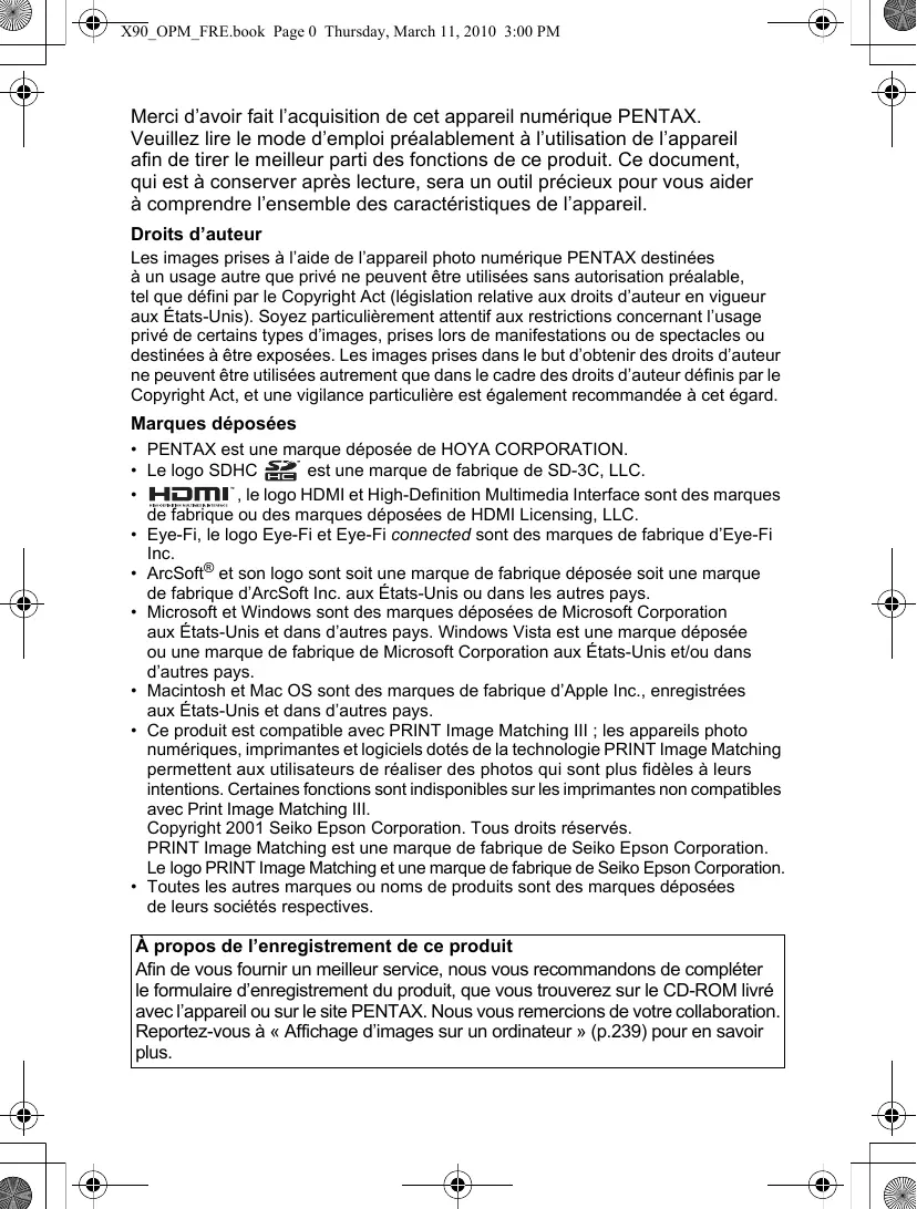 - Toutes les autres marques ou noms de produits sont des marques déposées de leurs sociétés respectives. À propos de l’enregistrement de ce produit Afin de vous fournir un meilleur service, nous vous recommandons de compléter le formulaire d’enregistrement du produit, que vous trouverez sur le CD-ROM livré avec l’appareil ou sur le site PENTAX. Nous vous remercions de votre collaboration. Reportez-vous à « Affichage d’images sur un ordinateur » (p.239) pour en savoir plus. X90_OPM_FRE.book Page 1 Thursday, March 11, 2010 3:00 PM À l’attention des utilisateurs de cet appareil