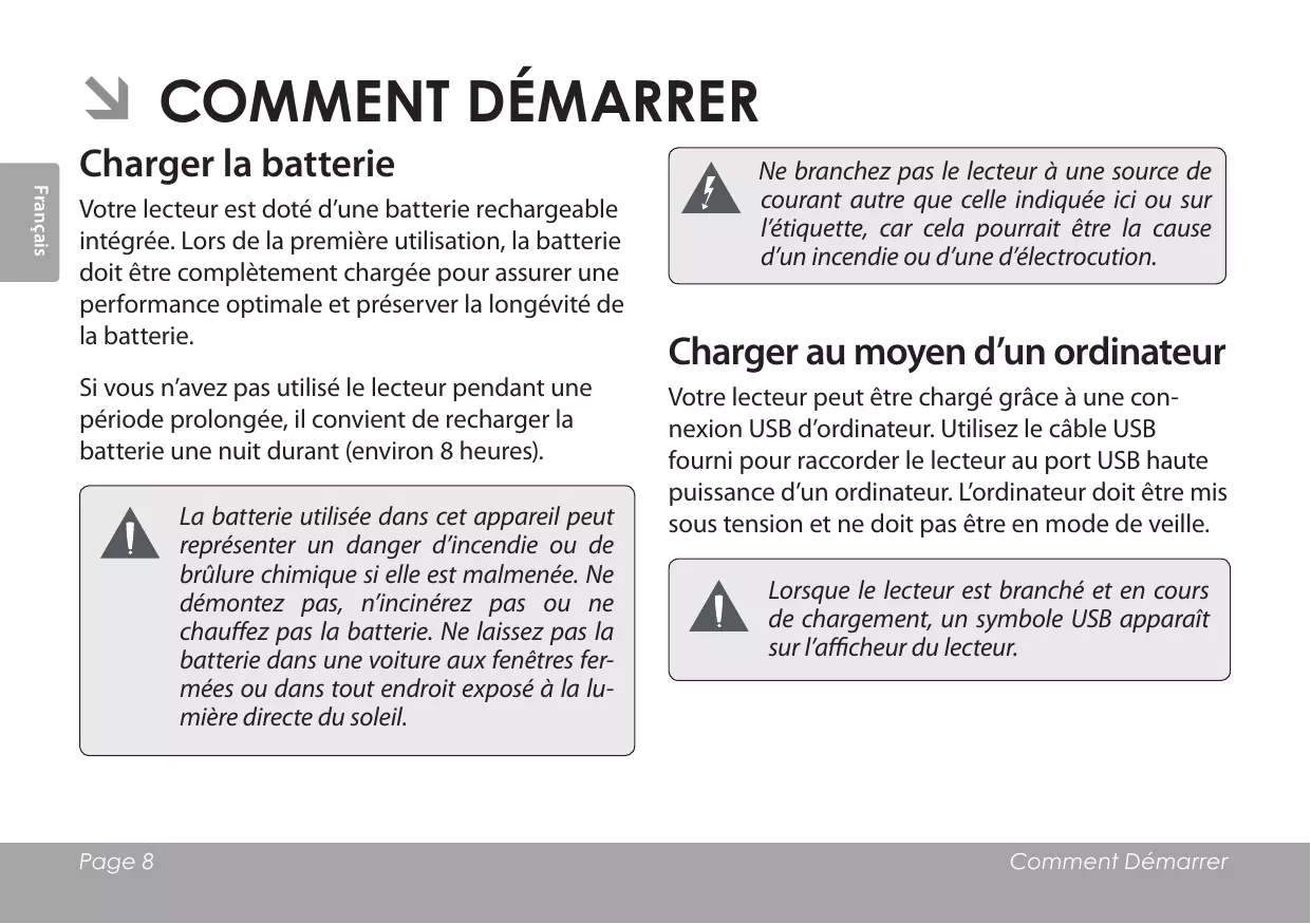 Français Charger la batterie Votre lecteur est doté d’une batterie rechargeable intégrée. Lors de la première utilisation, la batterie doit être complètement chargée pour assurer une performance optimale et préserver la longévité de la batterie. Si vous n’avez pas utilisé le lecteur pendant une période prolongée, il convient de recharger la batterie une nuit durant (environ 8 heures). La batterie utilisée dans cet appareil peut représenter un danger d’incendie ou de brûlure chimique si elle est malmenée. Ne démontez pas, n’incinérez pas ou ne chauffez pas la batterie. Ne laissez pas la batterie dans une voiture aux fenêtres fermées ou dans tout endroit exposé à la lumière directe du soleil. Page 8 Ne branchez pas le lecteur à une source de courant autre que celle indiquée ici ou sur l’étiquette, car cela pourrait être la cause d’un incendie ou d’une d’électrocution. Charger au moyen d’un ordinateur Votre lecteur peut être chargé grâce à une connexion USB d’ordinateur. Utilisez le câble USB fourni pour raccorder le lecteur au port USB haute puissance d’un ordinateur. L’ordinateur doit être mis sous tension et ne doit pas être en mode de veille. Lorsque le lecteur est branché et en cours de chargement, un symbole USB apparaît sur l’afficheur du lecteur. Comment Démarrer Pour mettre en marche le lecteur, maintenez enfoncée la touche <ENTER> jusqu’à ce que l’écran s’illumine. Pour éteindre le lecteur, maintenez enfoncée la touche <ENTER> jusqu’à ce que l’écran s’éteigne. Réinitialisation du lecteur Réinitialisez le lecteur s’il se bloque et ne répond pas ou en cas de dysfonctionnement.