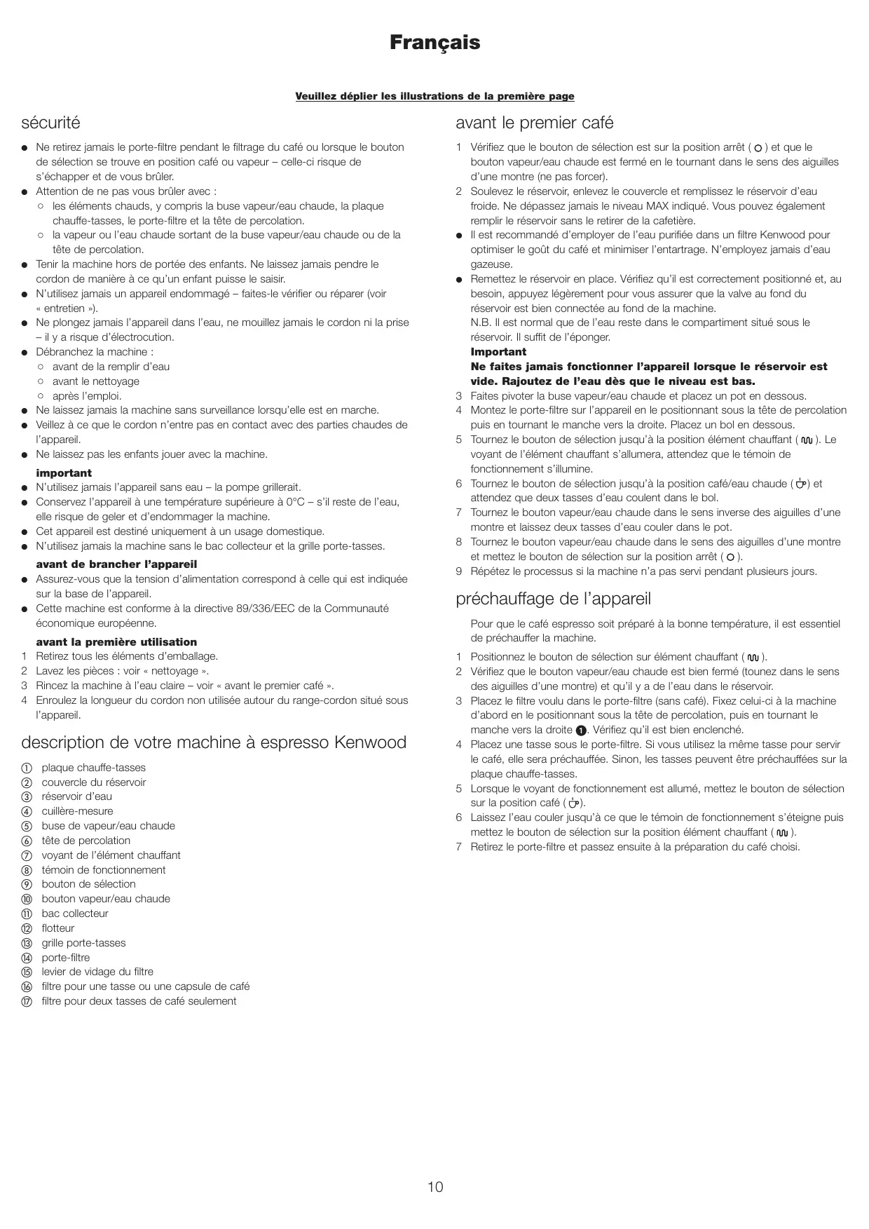 avant le premier café Ne retirez jamais le porte-filtre pendant le filtrage du café ou lorsque le bouton de sélection se trouve en position café ou vapeur – celle-ci risque de s’échapper et de vous brûler. Attention de ne pas vous brûler avec : ● les éléments chauds, y compris la buse vapeur/eau chaude, la plaque chauffe-tasses, le porte-filtre et la tête de percolation. ● la vapeur ou l’eau chaude sortant de la buse vapeur/eau chaude ou de la tête de percolation. Tenir la machine hors de portée des enfants. Ne laissez jamais pendre le cordon de manière à ce qu’un enfant puisse le saisir. N’utilisez jamais un appareil endommagé – faites-le vérifier ou réparer (voir « entretien »). Ne plongez jamais l’appareil dans l’eau, ne mouillez jamais le cordon ni la prise – il y a risque d’électrocution. Débranchez la machine : ● avant de la remplir d’eau ● avant le nettoyage ● après l’emploi. Ne laissez jamais la machine sans surveillance lorsqu’elle est en marche. Veillez à ce que le cordon n’entre pas en contact avec des parties chaudes de l’appareil. Ne laissez pas les enfants jouer avec la machine. 1 Vérifiez que le bouton de sélection est sur la position arrêt ( ) et que le bouton vapeur/eau chaude est fermé en le tournant dans le sens des aiguilles d’une montre (ne pas forcer). 2 Soulevez le réservoir, enlevez le couvercle et remplissez le réservoir d’eau froide. Ne dépassez jamais le niveau MAX indiqué. Vous pouvez également remplir le réservoir sans le retirer de la cafetière. ● Il est recommandé d’employer de l’eau purifiée dans un filtre Kenwood pour optimiser le goût du café et minimiser l’entartrage. N’employez jamais d’eau gazeuse. ● Remettez le réservoir en place. Vérifiez qu’il est correctement positionné et, au besoin, appuyez légèrement pour vous assurer que la valve au fond du réservoir est bien connectée au fond de la machine. N.B. Il est normal que de l’eau reste dans le compartiment situé sous le réservoir. Il suffit de l’éponger. Important Ne faites jamais fonctionner l’appareil lorsque le réservoir est vide. Rajoutez de l’eau dès que le niveau est bas. 3 Faites pivoter la buse vapeur/eau chaude et placez un pot en dessous. 4 Montez le porte-filtre sur l’appareil en le positionnant sous la tête de percolation puis en tournant le manche vers la droite. Placez un bol en dessous. 5 Tournez le bouton de sélection jusqu’à la position élément chauffant ( ). Le voyant de l’élément chauffant s’allumera, attendez que le témoin de fonctionnement s’illumine. 6 Tournez le bouton de sélection jusqu’à la position café/eau chaude ( ) et attendez que deux tasses d’eau coulent dans le bol. 7 Tournez le bouton vapeur/eau chaude dans le sens inverse des aiguilles d’une montre et laissez deux tasses d’eau couler dans le pot. 8 Tournez le bouton vapeur/eau chaude dans le sens des aiguilles d’une montre et mettez le bouton de sélection sur la position arrêt ( ). 9 Répétez le processus si la machine n’a pas servi pendant plusieurs jours. important N’utilisez jamais l’appareil sans eau – la pompe grillerait. Conservez l’appareil à une température supérieure à 0°C – s’il reste de l’eau, elle risque de geler et d’endommager la machine. Cet appareil est destiné uniquement à un usage domestique. N’utilisez jamais la machine sans le bac collecteur et la grille porte-tasses. avant de brancher l’appareil Assurez-vous que la tension d’alimentation correspond à celle qui est indiquée sur la base de l’appareil. Cette machine est conforme à la directive 89/336/EEC de la Communauté économique européenne. préchauffage de l’appareil Pour que le café espresso soit préparé à la bonne température, il est essentiel de préchauffer la machine. avant la première utilisation Retirez tous les éléments d’emballage. Lavez les pièces : voir « nettoyage ». Rincez la machine à l’eau claire – voir « avant le premier café ». Enroulez la longueur du cordon non utilisée autour du range-cordon situé sous l’appareil. 1 Positionnez le bouton de sélection sur élément chauffant ( 2 Vérifiez que le bouton vapeur/eau chaude est bien fermé (tounez dans le sens des aiguilles d’une montre) et qu’il y a de l’eau dans le réservoir. 3 Placez le filtre voulu dans le porte-filtre (sans café). Fixez celui-ci à la machine d’abord en le positionnant sous la tête de percolation, puis en tournant le manche vers la droite . Vérifiez qu’il est bien enclenché. 4 Placez une tasse sous le porte-filtre. Si vous utilisez la même tasse pour servir le café, elle sera préchauffée. Sinon, les tasses peuvent être préchauffées sur la plaque chauffe-tasses. 5 Lorsque le voyant de fonctionnement est allumé, mettez le bouton de sélection sur la position café ( ). 6 Laissez l’eau couler jusqu’à ce que le témoin de fonctionnement s’éteigne puis mettez le bouton de sélection sur la position élément chauffant ( 7 Retirez le porte-filtre et passez ensuite à la préparation du café choisi. description de votre machine à espresso Kenwood