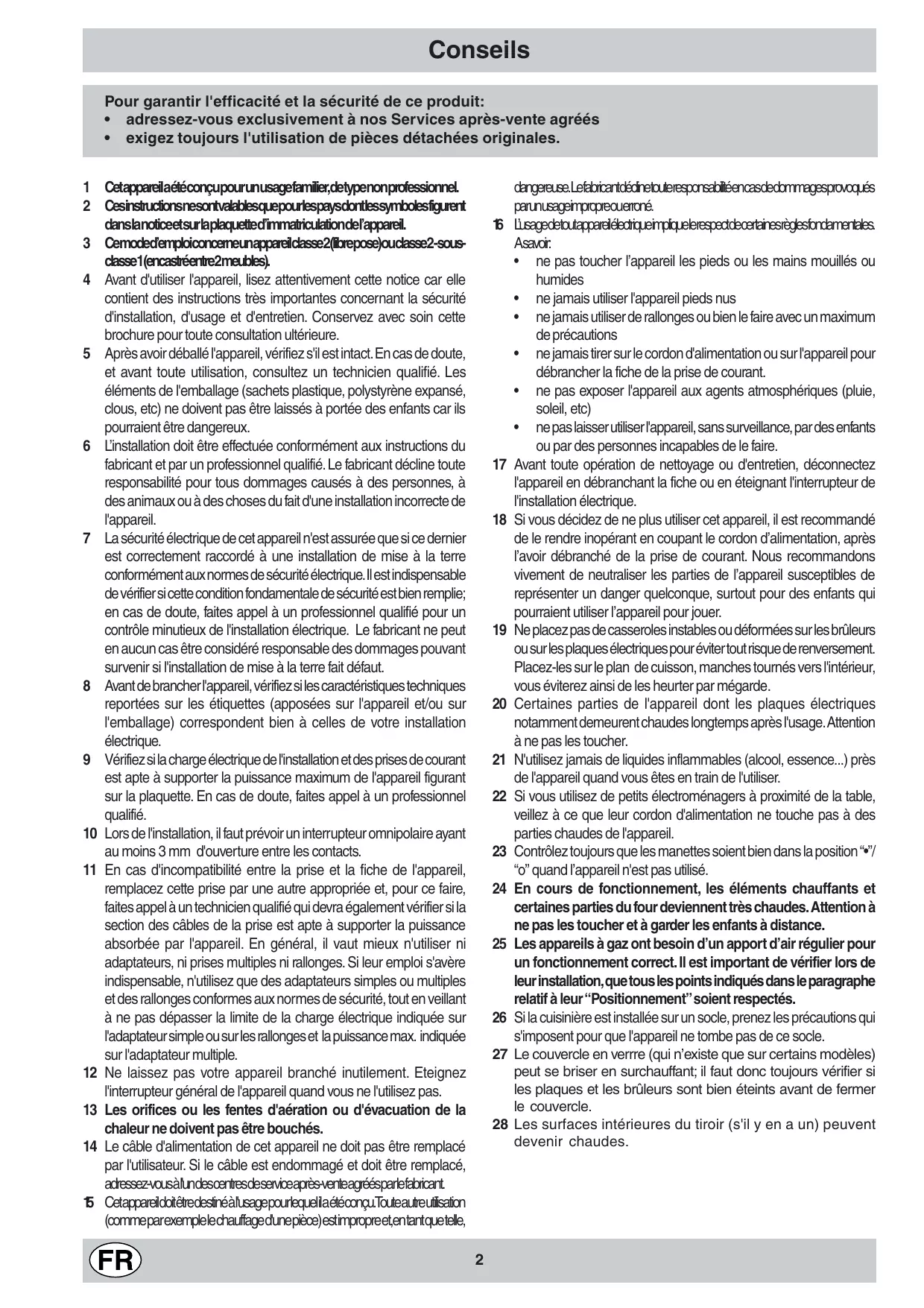 Conseils Pour garantir l'efficacité et la sécurité de ce produit: • adressez-vous exclusivement à nos Services après-vente agréés • exigez toujours l'utilisation de pièces détachées originales. 1 Cetappareilaétéconçupourunusagefamilier,detypenonprofessionnel. 2 Cesinstructionsnesontvalablesquepourlespaysdontlessymbolesfigurent danslanoticeetsurlaplaquetted’immatriculationdel’appareil. 3 Cemoded’emploiconcerneunappareilclasse2(librepose)ouclasse2-sousclasse1(encastréentre2meubles). 4 Avant d'utiliser l'appareil, lisez attentivement cette notice car elle contient des instructions très importantes concernant la sécurité d'installation, d'usage et d'entretien. Conservez avec soin cette brochure pour toute consultation ultérieure. 5 Après avoir déballé l'appareil, vérifiez s'il est intact. En cas de doute, et avant toute utilisation, consultez un technicien qualifié. Les éléments de l'emballage (sachets plastique, polystyrène expansé, clous, etc) ne doivent pas être laissés à portée des enfants car ils pourraient être dangereux. 6 L’installation doit être effectuée conformément aux instructions du fabricant et par un professionnel qualifié. Le fabricant décline toute responsabilité pour tous dommages causés à des personnes, à des animaux ou à des choses du fait d'une installation incorrecte de l'appareil. 7 La sécurité électrique de cet appareil n'est assurée que si ce dernier est correctement raccordé à une installation de mise à la terre conformément aux normes de sécurité électrique.Il est indispensable de vérifier si cette condition fondamentale de sécurité est bien remplie; en cas de doute, faites appel à un professionnel qualifié pour un contrôle minutieux de l'installation électrique. Le fabricant ne peut en aucun cas être considéré responsable des dommages pouvant survenir si l'installation de mise à la terre fait défaut. 8 Avant de brancher l'appareil, vérifiez si les caractéristiques techniques reportées sur les étiquettes (apposées sur l'appareil et/ou sur l'emballage) correspondent bien à celles de votre installation électrique. 9 Vérifiez si la charge électrique de l'installation et des prises de courant est apte à supporter la puissance maximum de l'appareil figurant sur la plaquette. En cas de doute, faites appel à un professionnel qualifié. 10 Lors de l'installation, il faut prévoir un interrupteur omnipolaire ayant au moins 3 mm d'ouverture entre les contacts. 11 En cas d'incompatibilité entre la prise et la fiche de l'appareil, remplacez cette prise par une autre appropriée et, pour ce faire, faites appel à un technicien qualifié qui devra également vérifier si la section des câbles de la prise est apte à supporter la puissance absorbée par l'appareil. En général, il vaut mieux n'utiliser ni adaptateurs, ni prises multiples ni rallonges. Si leur emploi s'avère indispensable, n'utilisez que des adaptateurs simples ou multiples et des rallonges conformes aux normes de sécurité, tout en veillant à ne pas dépasser la limite de la charge électrique indiquée sur l'adaptateur simple ou sur les rallonges et la puissance max. indiquée sur l'adaptateur multiple. 12 Ne laissez pas votre appareil branché inutilement. Eteignez l'interrupteur général de l'appareil quand vous ne l'utilisez pas. 13 Les orifices ou les fentes d'aération ou d'évacuation de la chaleur ne doivent pas être bouchés. 14 Le câble d'alimentation de cet appareil ne doit pas être remplacé par l'utilisateur. Si le câble est endommagé et doit être remplacé, adressez-vousàl'undescentresdeserviceaprès-venteagréésparlefabricant. 15 Cetappareildoitêtredestinéàl'usagepourlequelilaétéconçu.Touteautreutilisation (commeparexemplelechauffaged'unepièce)estimpropreet,entantquetelle,