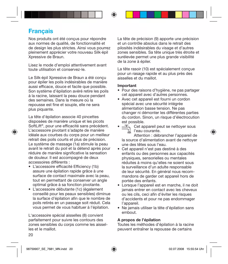poils sous la peau et des irritations (comme des démangeaisons, de l’inconfort ou des rougeurs corporelles), dépendant de l’état de la peau et des poils. Ces réactions sont normales et devraient rapidement disparaître, mais elles peuvent être accentuées si vous vous épilez pour les premières fois ou si vous avez la peau sensible. L’utilisation des lingettes préépilation vous aidera à prévenir toute irritation. L’épilation est plus facile et plus agréable quand les poils sont d’une longueur comprise entre 2 et 5 mm. Si vos poils sont plus longs, nous vous conseillons de les couper à la longueur recommandée. Si après 36 heures, la peau est toujours irritée, nous vous conseillons de contacter votre médecin. En général, les réactions de la peau et l’inconfort s’atténuent considérablement au fur et à mesure des épilations avec Silk·épil. Au début, nous vous conseillons de vous épiler le soir : les rougeurs éventuelles disparaîtront au cours de la nuit. Pour assouplir la peau, nous vous recommandons d’appliquer une crème hydratante après l’épilation. Certains cas d’inflammation de la peau peuvent être dus à l’intrusion de bactérie dans la peau (lors du passage de l’appareil sur la peau, par exemple). Le fait de nettoyer minutieusement la tête d’épilation avant chaque épilation réduit ce risque d’infection. Des poils très fins peuvent parfois repousser sous la peau. Pour éviter ces poils incarnés, nous vous conseillons d’utiliser régulièrement un gant de crin ou de procéder à des exfoliations. En effet, grâce à l’action exfoliante, les cellules mortes sont retirées permettant ainsi aux poils fins de ne pas rester bloqués sous la peau. Si vous avez le moindre doute quant à l’utilisation de cet appareil, n’hésitez pas à consulter votre médecin traitant. Il est important de consulter son médecin avant une épilation dans les cas suivants : – eczéma, blessures, inflammations cutanées (follicules purulents) et varices, – grains de beauté, – immunité affaiblie de la peau, comme diabètes, grossesse, maladie de Raynaud, hémophilie ou déficience immunitaire. Quelques petits trucs utiles Si vous n’avez jamais utilisé d’épilateur, ou si vous ne vous êtes pas épilé depuis longtemps, il faudra un peu de temps pour que votre peau s’adapte au procédé de l’épilation. L’inconfort ressenti lors de la première 98759907_SE_7681_MN.indd 21 épilation se réduit considérablement lors des utilisations suivantes : en effet le nombre de poils à épiler diminue avec le temps et la peau s’adapte au procédé de l’épilation. Description