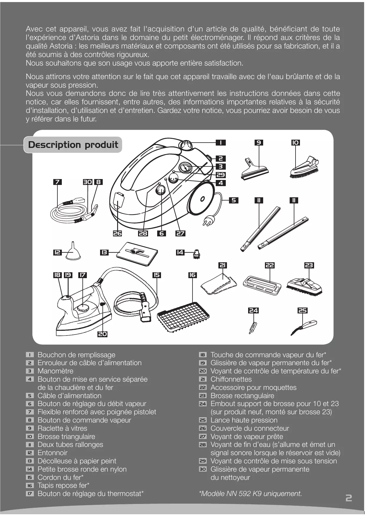 • La vapeur est efficace pour déboucher les écoulements sanitaires. Conseils pour l’utilisation des accessoires Avant de procéder au nettoyage de vos tapis, moquettes, tissus et autres surfaces délicates, veuillez consultez les instructions propres à chaque article. Cherchez un endroit caché ou un échantillon et faites un essai. Attendez que la vapeur agisse et vérifiez qu’aucun changement de couleur ni aucune déformation ne se soit produit. L’embout support de brosse (24) : Important : Sur le produit neuf, le support de brosse (24) est monté sur la brosse rectangulaire (23). Pour pouvoir le démonter, le faire pivoter de 180 degrés par rapport à sa position normale, et tirer. S’adapte à la fois sur la brosse rectangulaire (23) et sur la brosse triangulaire (10). D’une manière générale, les brosses rectangulaire et triangulaire sont à munir d’une chiffonnette (21) (fixée par les pinces supérieures). La brosse triangulaire (10) : Est particulièrement recommandée pour les textiles. Sa forme particulière permet de nettoyer les angles et les recoins difficiles d’accès. La brosse rectangulaire (23) : Est adaptée pour les grandes surfaces telles que les sols ou les murs. En cas de saleté incrustée, l’utiliser sans chiffonnette, en agissant directement avec les poils. Remettre une chiffonnette (21) par la suite pour éliminer les résidus. L’accessoire pour moquettes (22) : Se fixe sous la brosse rectangulaire (23) et permet de nettoyer les moquettes avec ou sans chiffonnette. En cas de tache, utiliser localement la petite lance haute pression (25) en orientant le jet à l’horizontale et au contact du tapis. Essuyer avec un chiffon. Petite brosse ronde nylon (14) : Se fixe à l’extrémité de la lance haute pression (25). Elle est adaptée au nettoyage de petites surfaces très sales. Les résidus ainsi décollés seront recueillis avec un chiffon ou une éponge. La raclette à vitres (9) : Permet de nettoyer les surfaces vitrées en utilisant un débit de vapeur réduit. Projeter la vapeur sur la vitre directement ou à quelques centimètres de dis- tance. Stopper la vapeur et passer la raclette de haut en bas pour recueillir la saleté. Essuyer régulièrement la raclette avec un chiffon. Attention, sur vitre froide, projeter la vapeur sur la vitre en tenant l’accessoire à une trentaine de centimètres de distance, avant de commencer le nettoyage. La lance haute pression (25) : Elle peut être utilisée avec ou sans petite brosse ronde. Le jet de vapeur concentré donne une puissance de nettoyage supplémentaire pour décaper ou décoller la saleté incrustée. Pratique pour nettoyeur les radiateurs, les volets, etc. La décolleuse à papier peint (13) : La vapeur émise permet de décoller les papiers peints sans difficultés, sans laisser de traces aux murs et dans un respect de l’environnement. Nettoyages particuliers Si vous souhaitez nettoyer des objets délicats, pensez toujours à éloigner la sortie vapeur de l’objet à nettoyer. Les Plantes : une distance de pulvérisation de trente centimètres minimum est à respecter impérativement sous peine d’abîmer les plantes. La Voiture : respecter une distance de pulvérisation de 10 à 20 cm pour nettoyer les pneus. Les jantes peuvent être nettoyées par contact direct. Pour enlever les tâches d’huile ou de goudron sur les carrosseries, utiliser toujours un chiffon doux et épais. Le Mobilier de jardin : que le mobilier soit en matière plastique ou en bois, pulvériser la vapeur à une distance suffisante pour ne pas le détériorer et essuyer ensuite avec un chiffon doux. Option fer professionnel Modèle NN 592 K9 uniquement Recommandations de sécurité générales