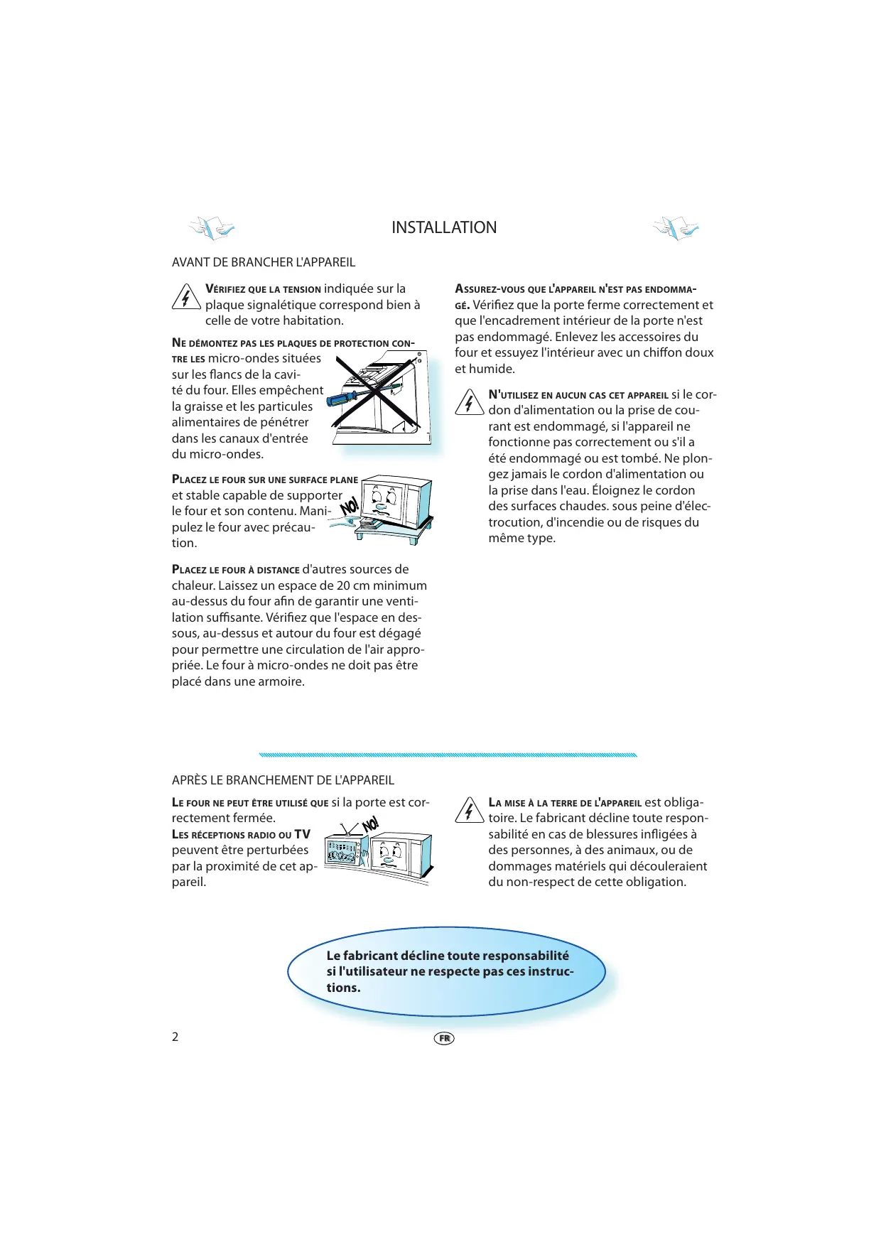 VÉRIFIEZ QUE LA TENSION indiquée sur la plaque signalétique correspond bien à celle de votre habitation. ASSUREZ-VOUS QUE L'APPAREIL N'EST PAS ENDOMMAGÉ. Vérifiez que la porte ferme correctement et que l'encadrement intérieur de la porte n'est pas endommagé. Enlevez les accessoires du four et essuyez l'intérieur avec un chiffon doux et humide. NE DÉMONTEZ PAS LES PLAQUES DE PROTECTION CONsituées sur les flancs de la cavité du four. Elles empêchent la graisse et les particules alimentaires de pénétrer dans les canaux d'entrée du micro-ondes. TRE LES micro-ondes N'UTILISEZ EN AUCUN CAS CET APPAREIL si le cordon d'alimentation ou la prise de courant est endommagé, si l'appareil ne fonctionne pas correctement ou s'il a été endommagé ou est tombé. Ne plongez jamais le cordon d'alimentation ou la prise dans l'eau. Éloignez le cordon des surfaces chaudes. sous peine d'électrocution, d'incendie ou de risques du même type. PLACEZ LE FOUR SUR UNE SURFACE PLANE et stable capable de supporter le four et son contenu. Manipulez le four avec précaution. PLACEZ LE FOUR À DISTANCE d'autres sources de chaleur. Laissez un espace de 20 cm minimum au-dessus du four afin de garantir une ventilation suffisante. Vérifiez que l'espace en dessous, au-dessus et autour du four est dégagé pour permettre une circulation de l'air appropriée. Le four à micro-ondes ne doit pas être placé dans une armoire.