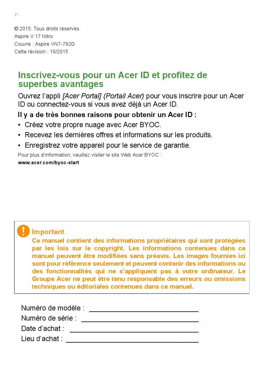 © 2015. Tous droits réservés. Aspire V 17 Nitro Couvre : Aspire VN7-792G Cette révision : 10/2015 Inscrivez-vous pour un Acer ID et profitez de superbes avantages Ouvrez l’appli [Acer Portal] (Portail Acer) pour vous inscrire pour un Acer ID ou connectez-vous si vous avez déjà un Acer ID. Il y a de très bonnes raisons pour obtenir un Acer ID :