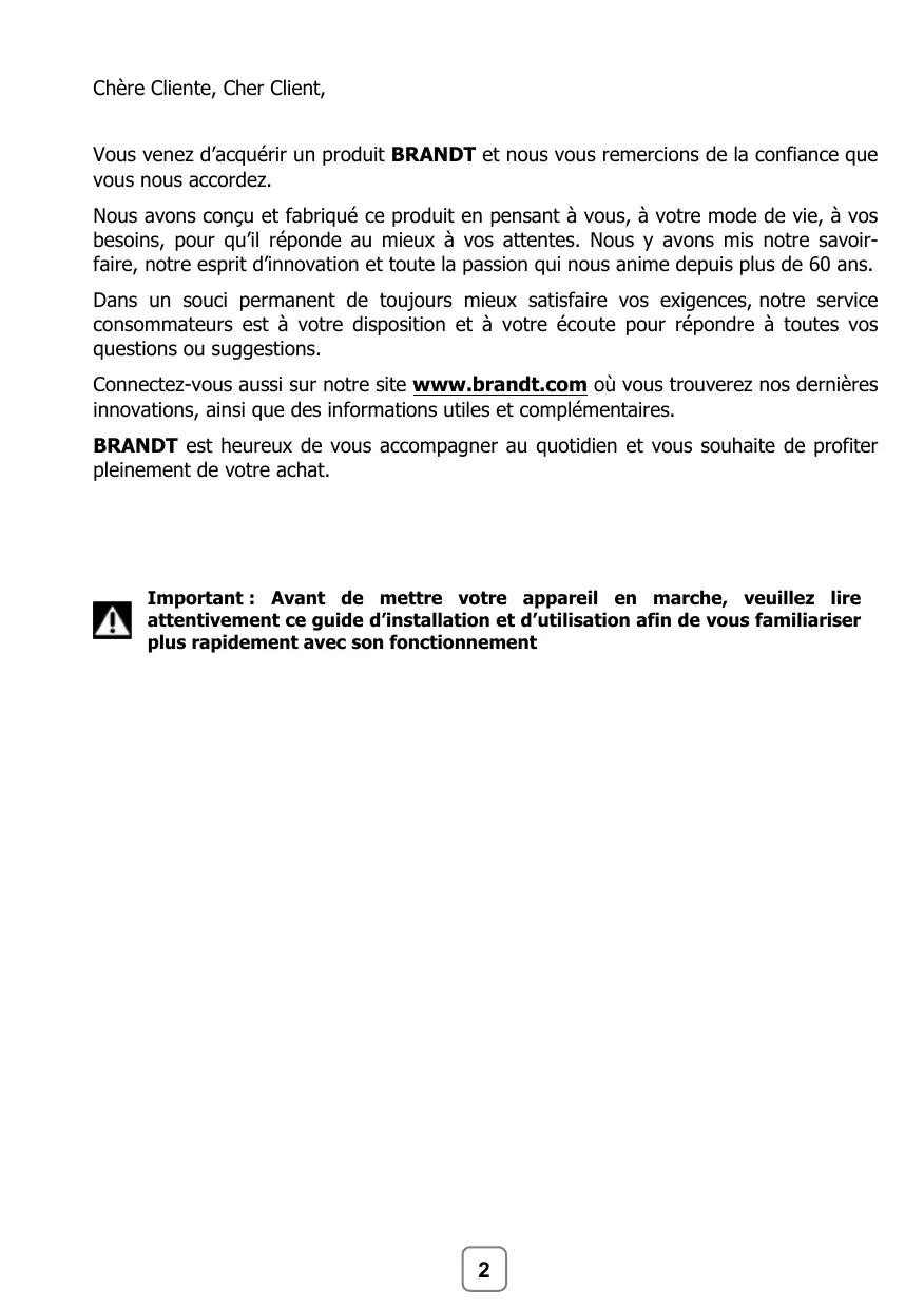 Vous venez d'acquérir un produit BRANDT et nous vous remercions de la confiance que vous nous accordez.