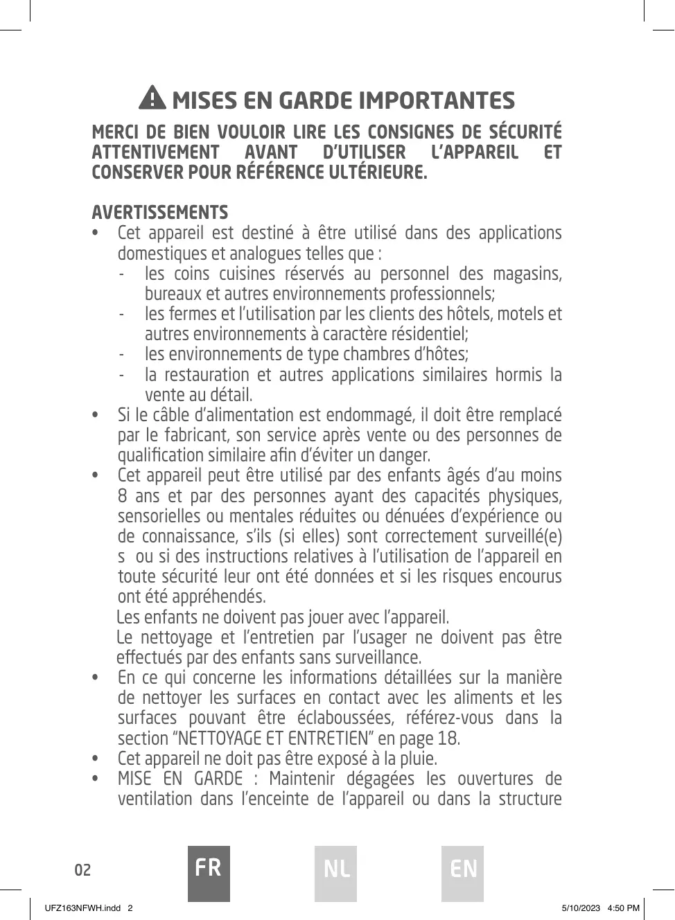 UFZ163NFWH.indd 22 5/10/2023 4:50 PM SERVICE DE RÉPARATION ET PIÈCES DE RECHANGE Ne démontez pas et ne réparez pas l’appareil vous-même. Ne pas respecter cette consigne peut entraîner un choc électrique ou des blessures. Pour demander une réparation professionnelle et commander des pièces de rechange, veuillez vous adresser au service après-vente FNAC DARTY. Les pièces de rechange pour vos appareils seront livrées sous 15 jours ouvrés après réception de la commande. Veuillez noter ! Tous les appareils ont une garantie de 2 ans. La garantie ne couvre pas les dommages causés par une mauvaise installation, une modification non autorisée, une auto-réparation ou une réparation non professionnelle. Contactez-nous : www.darty.com 24 heures / 24 7 jours / 7 9 Rue des Bateaux-Lavoirs, 94200 Ivry-sur-Seine, France www.vandenborre.be 8h – 18h Lundi à Samedi Slesbroekstraat 101 1600 Sint-Pieters-Leeuw Belgium
