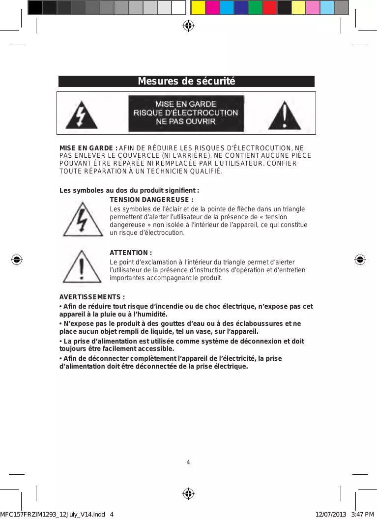 12/07/2013 3:47 PM Mesures de sécurité MISE EN GARDE : AFIN DE RÉDUIRE LES RISQUES D’ÉLECTROCUTION, NE PAS ENLEVER LE COUVERCLE (NI L'ARRIÈRE). NE CONTIENT AUCUNE PIÈCE POUVANT ÊTRE RÉPARÉE NI REMPLACÉE PAR L'UTILISATEUR. CONFIER TOUTE RÉPARATION À UN TECHNICIEN QUALIFIÉ. Les symboles au dos du produit signifient : TENSION DANGEREUSE : Les symboles de l’éclair et de la pointe de flèche dans un triangle permettent d’alerter l’utilisateur de la présence de « tension dangereuse » non isolée à l’intérieur de l’appareil, ce qui constitue un risque d’électrocution. ATTENTION : Le point d’exclamation à l’intérieur du triangle permet d’alerter l’utilisateur de la présence d’instructions d’opération et d’entretien importantes accompagnant le produit. AVERTISSEMENTS :