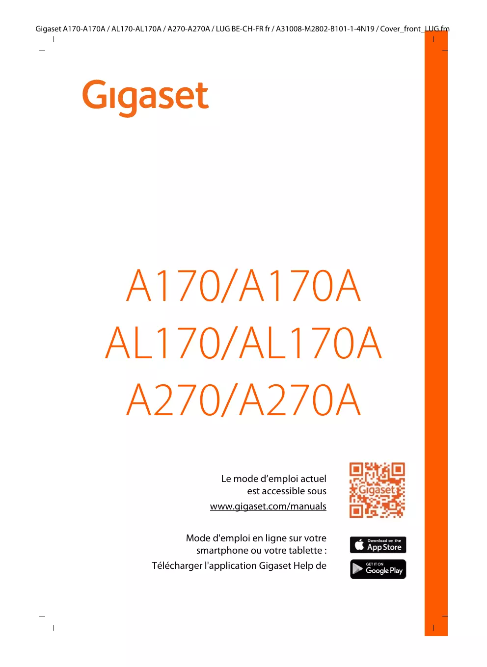 - Gigaset A170-A170A / AL170-AL170A / A270-A270A / LUG BE-CH-FR fr / A31008-M2802-B101-1-4N19 / Cover_front_LUG.fm A170/A170A AL170/AL170A A270/A270A Le mode d’emploi actuel est accessible sous www.gigaset.com/manuals Mode d'emploi en ligne sur votre smartphone ou votre tablette : Télécharger l'application Gigaset Help de Gigaset A170-A170A / AL170-AL170A / A270-A270A / LUG BE-CH-FR fr / A31008-M2802-B101-1-4N19 / LUGIVZ.fm / 31.1.18 Contenu Template Go, Version 1, 01.07.2014 / ModuleVersion 1.0 Contenu Aperçu du combiné p. 4