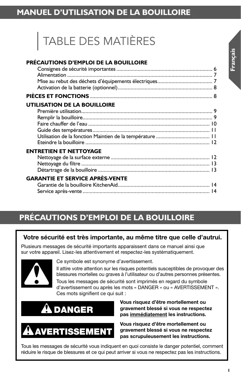 Garantie de la bouilloire KitchenAid.................................................................. 14 Service après-vente........................................................................................... 14 Précautions d’emploi de la bouilloire Votre sécurité est très importante, au même titre que celle d’autrui. Plusieurs messages de sécurité importants apparaissent dans ce manuel ainsi que sur votre appareil. Lisez-les attentivement et respectez-les systématiquement. Ce symbole est synonyme d’avertissement. Il attire votre attention sur les risques potentiels susceptibles de provoquer des blessures mortelles ou graves à l’utilisateur ou d’autres personnes présentes. Tous les messages de sécurité sont imprimés en regard du symbole d’avertissement ou après les mots « DANGER » ou « AVERTISSEMENT ». Ces mots signifient ce qui suit : DANGER Vous risquez d’être mortellement ou gravement blessé si vous ne respectez pas immédiatement les instructions. AVERTISSEMENT Vous risquez d’être mortellement ou gravement blessé si vous ne respectez pas scrupuleusement les instructions. Tous les messages de sécurité vous indiquent en quoi consiste le danger potentiel, comment réduire le risque de blessures et ce qui peut arriver si vous ne respectez pas les instructions.