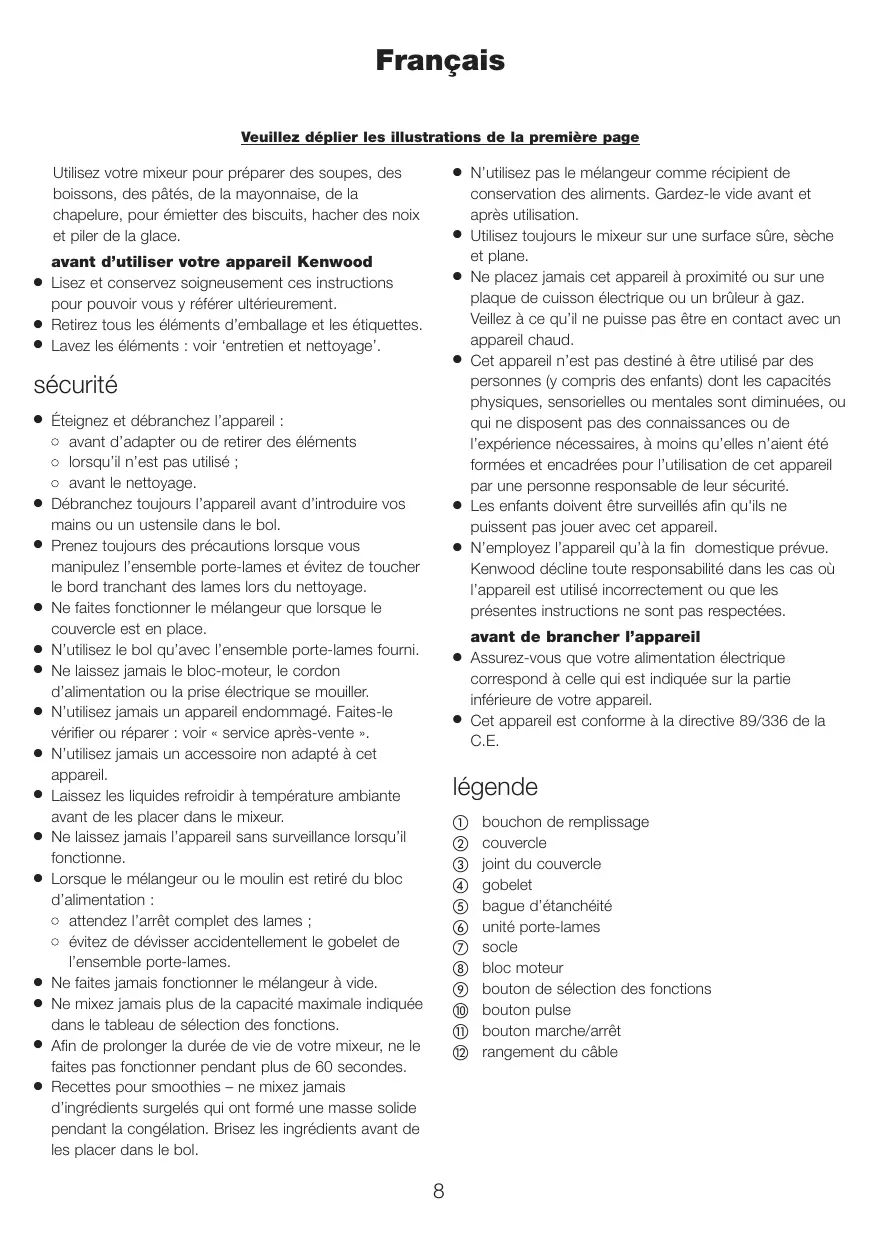 ● Ne placez jamais cet appareil à proximité ou sur une plaque de cuisson électrique ou un brûleur à gaz. Veillez à ce qu’il ne puisse pas être en contact avec un appareil chaud. Cet appareil n’est pas destiné à être utilisé par des personnes (y compris des enfants) dont les capacités physiques, sensorielles ou mentales sont diminuées, ou qui ne disposent pas des connaissances ou de l’expérience nécessaires, à moins qu’elles n’aient été formées et encadrées pour l’utilisation de cet appareil par une personne responsable de leur sécurité. Les enfants doivent être surveillés afin qu'ils ne puissent pas jouer avec cet appareil. N’employez l’appareil qu’à la fin domestique prévue. Kenwood décline toute responsabilité dans les cas où l’appareil est utilisé incorrectement ou que les présentes instructions ne sont pas respectées. avant de brancher l’appareil Assurez-vous que votre alimentation électrique correspond à celle qui est indiquée sur la partie inférieure de votre appareil. Cet appareil est conforme à la directive 89/336 de la C.E.