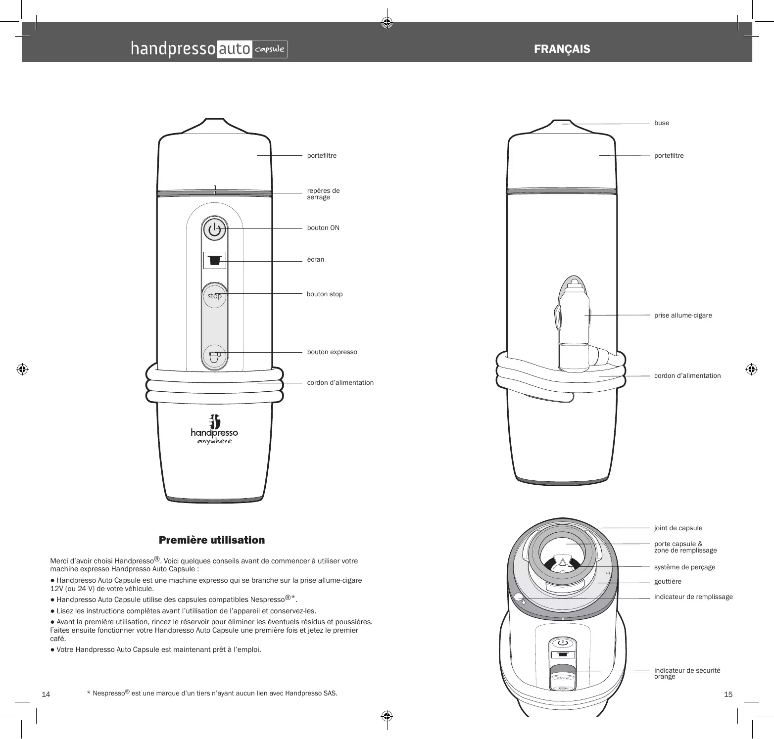 designed by Handpresso in Fontainebleau, France FRANÇAIS buse portefiltre portefiltre repères de serrage bouton ON écran bouton stop prise allume-cigare bouton expresso cordon d’alimentation cordon d’alimentation joint de capsule Première utilisation Merci d’avoir choisi Handpresso®. Voici quelques conseils avant de commencer à utiliser votre machine expresso Handpresso Auto Capsule : ● Handpresso Auto Capsule est une machine expresso qui se branche sur la prise allume-cigare 12V (ou 24 V) de votre véhicule. ● Handpresso Auto Capsule utilise des capsules compatibles Nespresso®*. ● Lisez les instructions complètes avant l’utilisation de l’appareil et conservez-les. ● Avant la première utilisation, rincez le réservoir pour éliminer les éventuels résidus et poussières. Faites ensuite fonctionner votre Handpresso Auto Capsule une première fois et jetez le premier café. ● Votre Handpresso Auto Capsule est maintenant prêt à l’emploi. porte capsule & zone de remplissage système de perçage gouttière indicateur de remplissage indicateur de sécurité orange