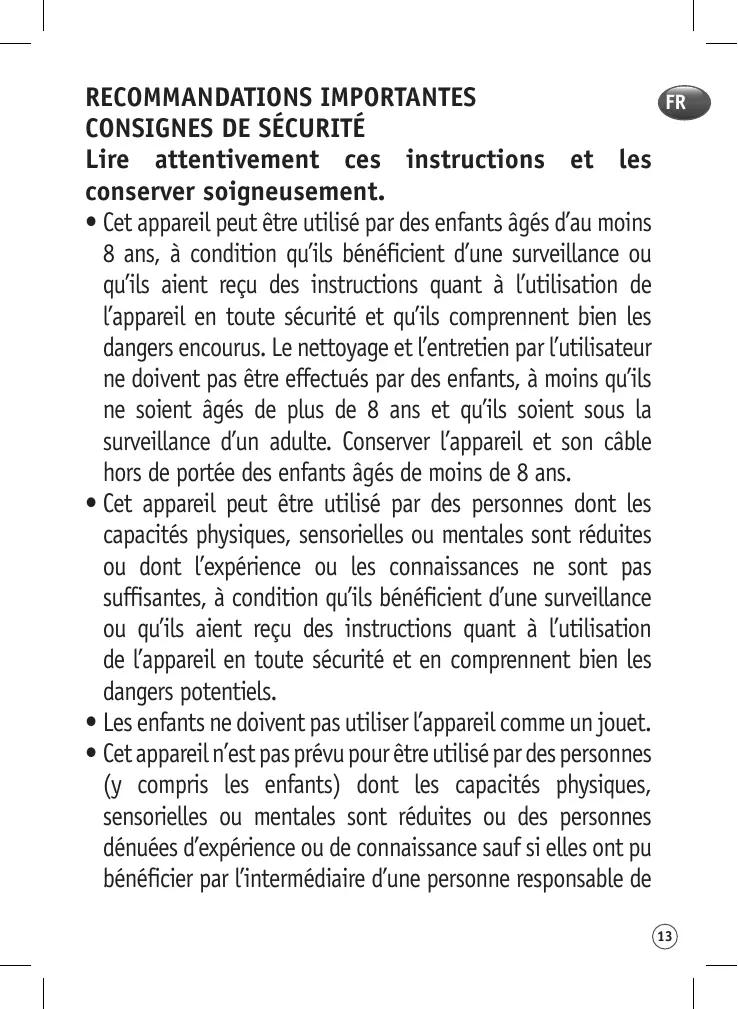 RECOMMANDATIONS IMPORTANTES CONSIGNES DE SÉCURITÉ Lire attentivement ces instructions et les conserver soigneusement. • Cet appareil peut être utilisé par des enfants âgés d’au moins 8 ans, à condition qu’ils bénéficient d’une surveillance ou qu’ils aient reçu des instructions quant à l’utilisation de l’appareil en toute sécurité et qu’ils comprennent bien les dangers encourus. Le nettoyage et l’entretien par l’utilisateur ne doivent pas être effectués par des enfants, à moins qu’ils ne soient âgés de plus de 8 ans et qu’ils soient sous la surveillance d’un adulte. Conserver l’appareil et son câble hors de portée des enfants âgés de moins de 8 ans. • Cet appareil peut être utilisé par des personnes dont les capacités physiques, sensorielles ou mentales sont réduites ou dont l’expérience ou les connaissances ne sont pas suffisantes, à condition qu’ils bénéficient d’une surveillance ou qu’ils aient reçu des instructions quant à l’utilisation de l’appareil en toute sécurité et en comprennent bien les dangers potentiels. • Les enfants ne doivent pas utiliser l’appareil comme un jouet. • Cet appareil n’est pas prévu pour être utilisé par des personnes (y compris les enfants) dont les capacités physiques, sensorielles ou mentales sont réduites ou des personnes dénuées d’expérience ou de connaissance sauf si elles ont pu bénéficier par l’intermédiaire d’une personne responsable de