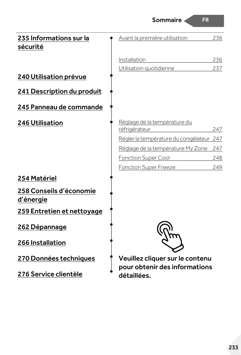 Les enfants ne doivent pas jouer avec l’appareil. Si du gaz réfrigérant ou tout autre gaz inflammable fuit à proximité de l’appareil, fermez la vanne du gaz qui fuit, ouvrez les portes et les fenêtres et ne débranchez pas le câble d’alimentation du réfrigérateur ou de tout autre appareil. Notez que l’appareil est conçu pour fonctionner dans une plage de température ambiante spécifique comprise entre 10 °C et 43 °C. L’appareil peut ne pas fonctionner correctement s’il est laissé pendant une longue période à une température inférieure ou supérieure à la plage indiquée. Ne placez pas d’objets instables (objets lourds, récipients remplis d’eau) sur le dessus du réfrigérateur, pour éviter les blessures corporelles causées par une chute ou une électrocution causée par le contact avec de l’eau. Ne tirez pas sur les balconnets. La porte peut être tirée en biais, le portebouteilles peut être retiré ou l’appareil risque de basculer. Ouvrez et fermez les portes uniquement avec les poignées. L’écart entre les portes et entre les portes et le compartiment est très étroit. Ne mettez pas vos mains dans ces zones pour éviter de vous pincer les doigts. Ouvrez ou fermez les portes du réfrigérateur uniquement lorsqu’il n’y a pas d’enfants dans le rayon de mouvement de la porte.