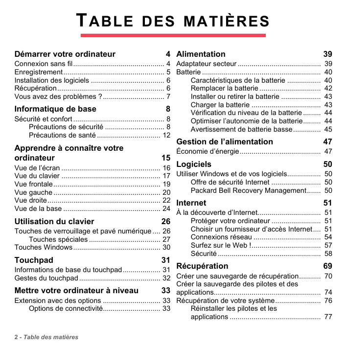 Démarrer votre ordinateur 4 Alimentation Connexion sans fil.............................................. Enregistrement................................................... Installation des logiciels ..................................... Récupération...................................................... Vous avez des problèmes ?............................... 4 Adaptateur secteur .......................................... 5 Batterie ............................................................ Caractéristiques de la batterie ................. Remplacer la batterie ............................... Installer ou retirer la batterie .................... Charger la batterie ................................... Informatique de base Vérification du niveau de la batterie ......... Sécurité et confort .............................................. 8 Optimiser l’autonomie de la batterie......... Précautions de sécurité .............................. 8 Avertissement de batterie basse.............. Précautions de santé ................................ 12 Apprendre à connaître votre ordinateur Gestion de l’alimentation