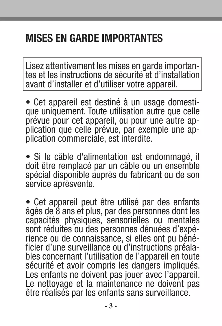 • Cet appareil peut être utilisé par des enfants âgés de 8 ans et plus, par des personnes dont les capacités physiques, sensorielles ou mentales sont réduites ou des personnes dénuées d’expérience ou de connaissance, si elles ont pu bénéficier d’une surveillance ou d’instructions préalables concernant l’utilisation de l’appareil en toute sécurité et avoir compris les dangers impliqués. Les enfants ne doivent pas jouer avec l’appareil. Le nettoyage et la maintenance ne doivent pas être réalisés par les enfants sans surveillance. -3-