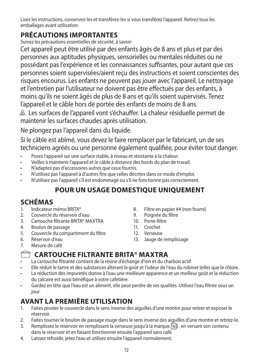 Remplissez le réservoir en remplissant la verseuse jusqu’à la marque , en versant son contenu dans le réservoir et en faisant fonctionner ensuite l’appareil sans café. Laissez refroidir, jetez l’eau et utilisez ensuite l’appareil normalement. 12