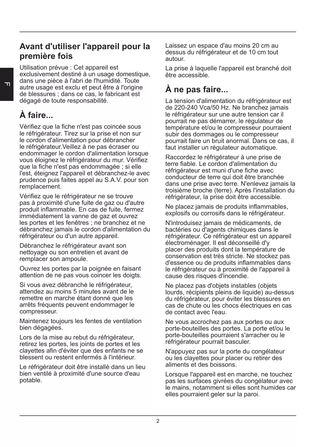 À ne pas faire... La tension d'alimentation du réfrigérateur est de 220-240 Vca/50 Hz. Ne branchez jamais le réfrigérateur sur une autre tension car il pourrait ne pas démarrer, le régulateur de température et/ou le compresseur pourraient subir des dommages ou le compresseur pourrait faire un bruit anormal. Dans ce cas, il faut installer un régulateur automatique.