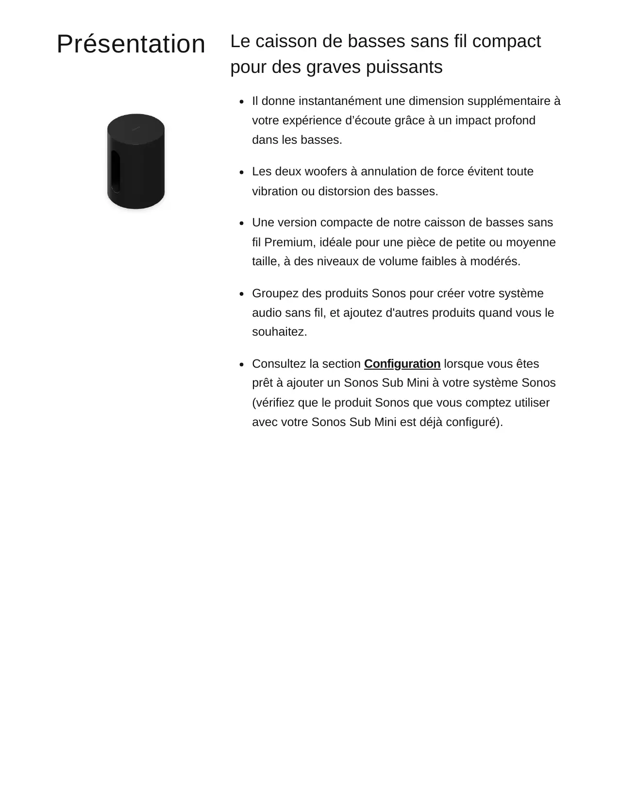 Sonos Sub Mini Gui… Sonos Su… Présentation Le caisson de basses sans fil compact pour des graves puissants Il donne instantanément une dimension supplémentaire à votre expérience d’écoute grâce à un impact profond dans les basses. Les deux woofers à annulation de force évitent toute vibration ou distorsion des basses. Une version compacte de notre caisson de basses sans fil Premium, idéale pour une pièce de petite ou moyenne taille, à des niveaux de volume faibles à modérés. Groupez des produits Sonos pour créer votre système audio sans fil, et ajoutez d'autres produits quand vous le souhaitez. Consultez la section Configuration lorsque vous êtes prêt à ajouter un Sonos Sub Mini à votre système Sonos (vérifiez que le produit Sonos que vous comptez utiliser avec votre Sonos Sub Mini est déjà configuré). Commandes et boutons