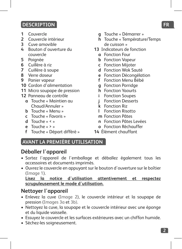 Couvercle Couvercle intérieur Cuve amovible Bouton d'ouverture du couvercle 5 Poignée 6 Cuillère à riz 7 Cuillère à soupe 8 Verre doseur 9 Panier vapeur 10 Cordon d’alimentation 11 Micro soupape de pression 12 Panneau de contrôle a Touche « Maintien au Chaud/Annuler » b Touche « Menu » c Touche « Favoris » d Touche « < » e Touche « > » f Touche « Départ différé »