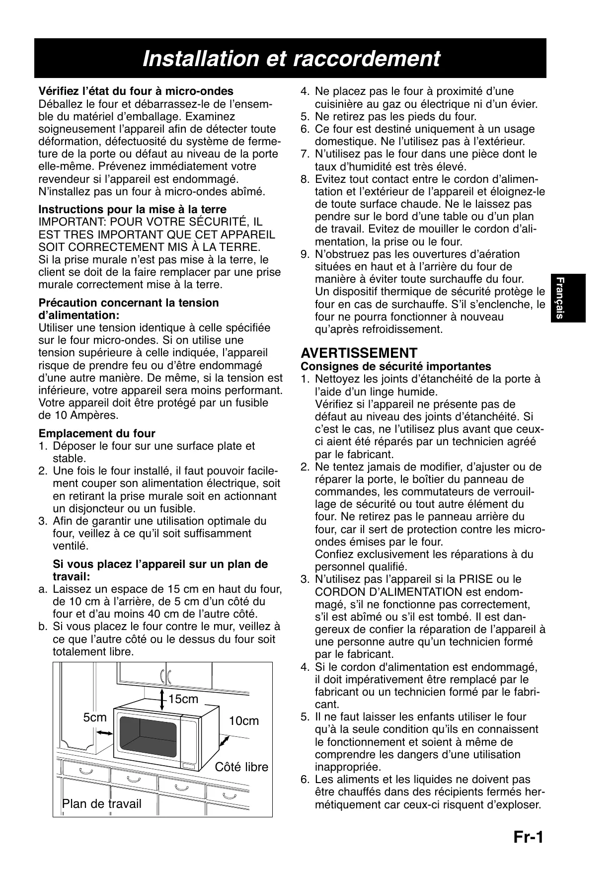 Précaution concernant la tension d’alimentation: Utiliser une tension identique à celle spécifiée sur le four micro-ondes. Si on utilise une tension supérieure à celle indiquée, l’appareil risque de prendre feu ou d’être endommagé d’une autre manière. De même, si la tension est inférieure, votre appareil sera moins performant. Votre appareil doit être protégé par un fusible de 10 Ampères. Emplacement du four 1. Déposer le four sur une surface plate et stable. 2. Une fois le four installé, il faut pouvoir facilement couper son alimentation électrique, soit en retirant la prise murale soit en actionnant un disjoncteur ou un fusible. 3. Afin de garantir une utilisation optimale du four, veillez à ce qu’il soit suffisamment ventilé. Si vous placez l’appareil sur un plan de travail: a. Laissez un espace de 15 cm en haut du four, de 10 cm à l’arrière, de 5 cm d’un côté du four et d’au moins 40 cm de l’autre côté. b. Si vous placez le four contre le mur, veillez à ce que l’autre côté ou le dessus du four soit totalement libre.