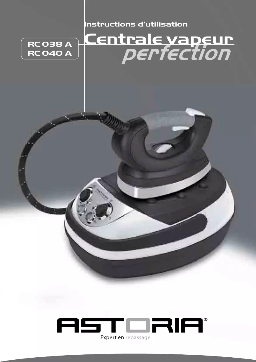 Instructions d’utilisation RC 038 A RC 040 A Centrale vapeur perfection Avec cet appareil, vous avez fait l’acquisition d’un article de qualité, bénéficiant de toute l’expérience d’Astoria dans le domaine du petit électroménager. Il répond aux critères de la qualité Astoria : les meilleurs matériaux et composants ont été utilisés pour sa fabrication, et il a été soumis à des contrôles rigoureux. Nous souhaitons que son usage vous apporte entière satisfaction. Nous attirons votre attention sur le fait que cet appareil travaille avec de l’eau brûlante et de la vapeur sous pression. Nous vous demandons donc de lire très attentivement les instructions données dans cette notice, car elles fournissent, entre autres, des informations importantes relatives à la sécurité d’installation, d’utilisation et d’entretien. Gardez votre notice, vous pourriez avoir besoin de vous y référer dans le futur.