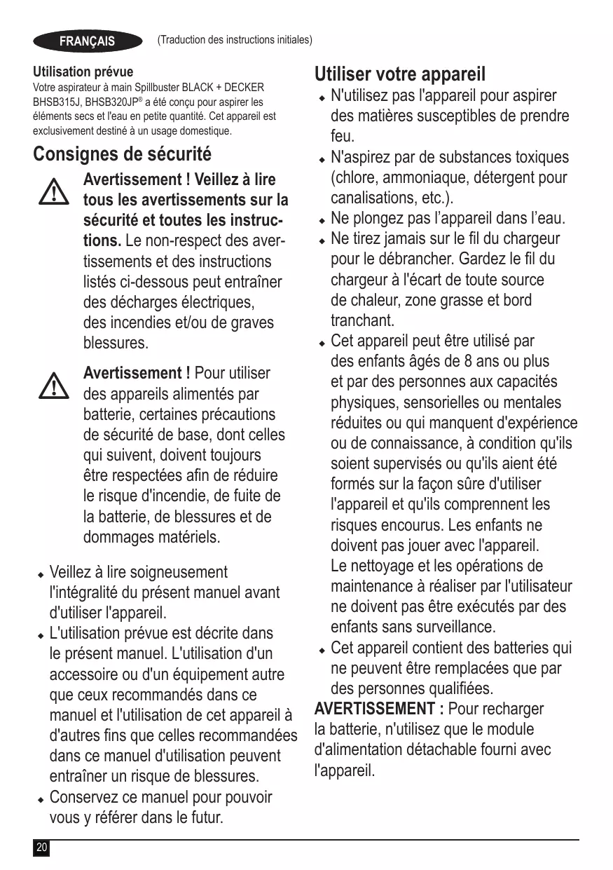 Votre aspirateur à main Spillbuster BLACK + DECKER BHSB315J, BHSB320JP® a été conçu pour aspirer les éléments secs et l'eau en petite quantité. Cet appareil est exclusivement destiné à un usage domestique.