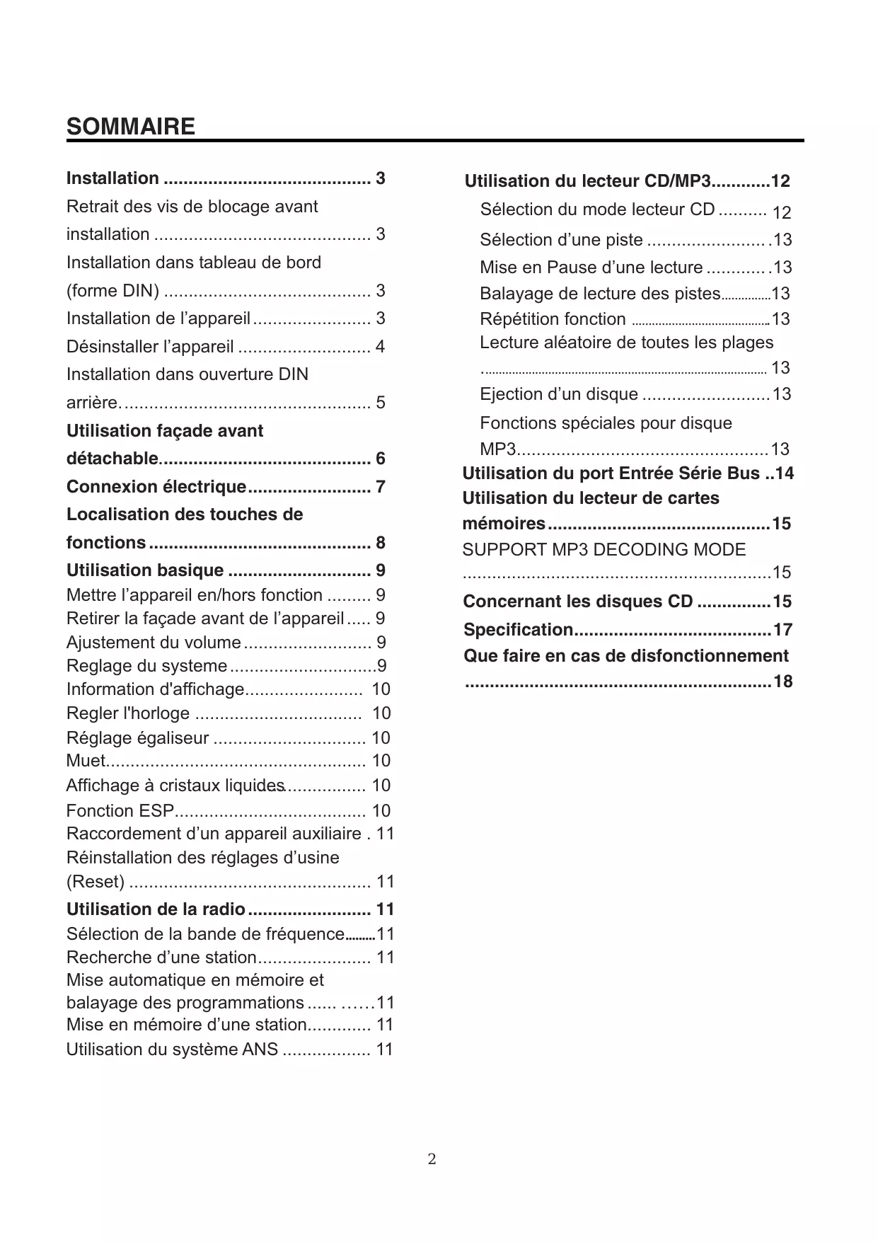 Vérifications à faire en cas de ∫ panne ª Avant de contrôler les différents points de la présente liste, vérifiez que toutes les connexionssont correctement effectuées. Si le problème persiste après avoir controlé les différents pointsde cette liste, consultez votre revendeur ou un service spécialisé en réparation. Symptômes Causes Solutions Le contact du véhicule n’est pas allumé. Si l’appareil est correctement raccordé au circuit d’alimentation de la voiture et que le moteur du véhicule ne tourne pas, placé la clé du contact sur la position«ACC». Le fusible a sauté. Remplacez le fusible défectueux. Il y a déjà un CD dans l’appareil. Ejectez d’abord le disque à l’intérieur du lecteur et introduisez ensuite le suivant. Le disque est introduit dans le mauvais sens. Introduisez le disque dans le lecteur, face avec le label vers lehaut. Le disque est extrêmement sale ou le disque est défectueux. Nettoyez le disque ou essayez delire un autre disque. La température à l’intérieur de la voiture est trop élevée. Attendez que la temperature Condensation. Ne faites pas fonctionner l’appareil Durant 1 heure et essayez ensuite à nouveau. La puissance volume est sur minimum. Ajustez la puissance volume au niveau qui vous convient. Les connexions ne sont pas correctement effectuées. Vérifiez les connexions. L’appareil est installé dans un angle supérieur à 30 degrés. Ajustez l’installation pour que l’angle de placement soit moins de 30 degrés. Le disque est sale ou griffé. Nettoyez le disque ou essayez de lire un autre disque. Les touches des contrôles ne fonctionnent pas Le microprocesseur interne du fait du bruit ne fonctionne pas correctement. Appuyez sur la touche RESET. La face avant de l’appareil n’est pas correctement fixée à sa place. La radio ne fonctionne pas. Les présélections radio ne fonctionnent pas Le câble d’antenne n’est pas raccordé. Connectez le cable d’antenne fermement. Le signal de réception est trop faible. Sélectionnez une station manuellement. Pas d’alimentation Le disque ne peut être chargé ou éjecté. Il n’y pas de son Il y a des coupures de son