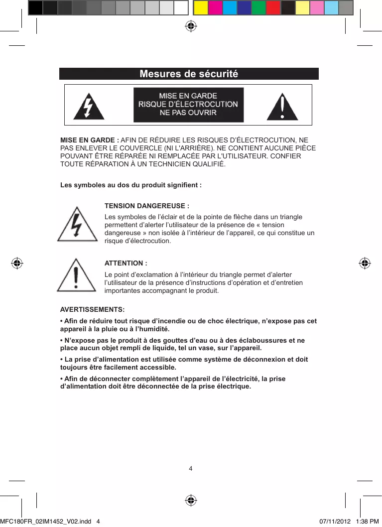 07/11/2012 1:38 PM Mesures de sécurité MISE EN GARDE : AFIN DE RÉDUIRE LES RISQUES D’ÉLECTROCUTION, NE PAS ENLEVER LE COUVERCLE (NI L'ARRIÈRE). NE CONTIENT AUCUNE PIÈCE POUVANT ÊTRE RÉPARÉE NI REMPLACÉE PAR L'UTILISATEUR. CONFIER TOUTE RÉPARATION À UN TECHNICIEN QUALIFIÉ. Les symboles au dos du produit signifient : TENSION DANGEREUSE : Les symboles de l’éclair et de la pointe de flèche dans un triangle permettent d’alerter l’utilisateur de la présence de « tension dangereuse » non isolée à l’intérieur de l’appareil, ce qui constitue un risque d’électrocution. ATTENTION : Le point d’exclamation à l’intérieur du triangle permet d’alerter l’utilisateur de la présence d’instructions d’opération et d’entretien importantes accompagnant le produit. AVERTISSEMENTS: