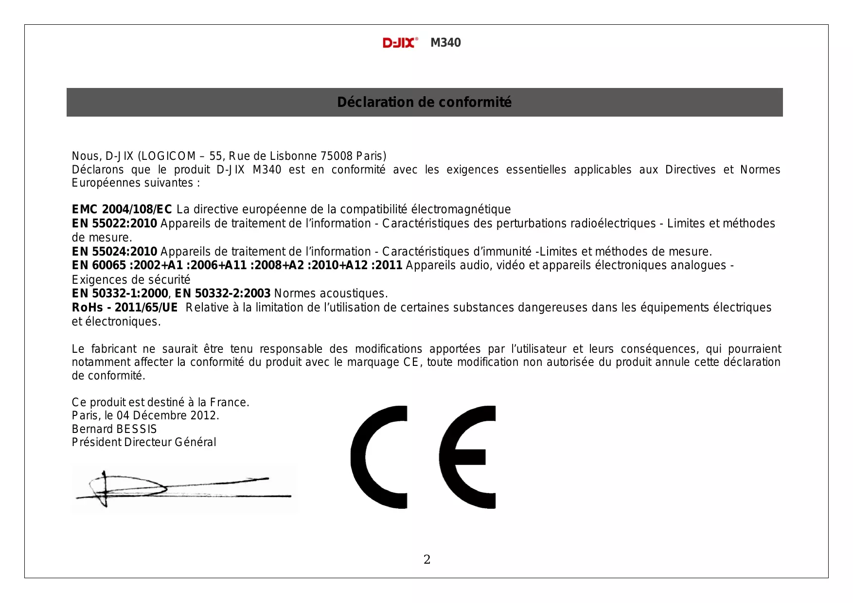 Déclarons que le produit D-JIX M340 est en conformité avec les exigences essentielles applicables aux Directives et Normes Européennes suivantes :