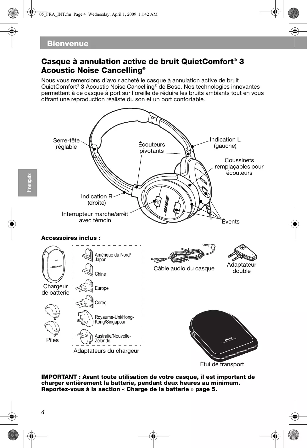 Nous vous remercions d'avoir acheté le casque à annulation active de bruit QuietComfort® 3 Acoustic Noise Cancellation® de Bose. Nos technologies innovantes permettent à ce casque à port sur l'oreille de réduire les bruits ambiants tout en vous offrant une reproduction réalisée du son et un port comfortable.
