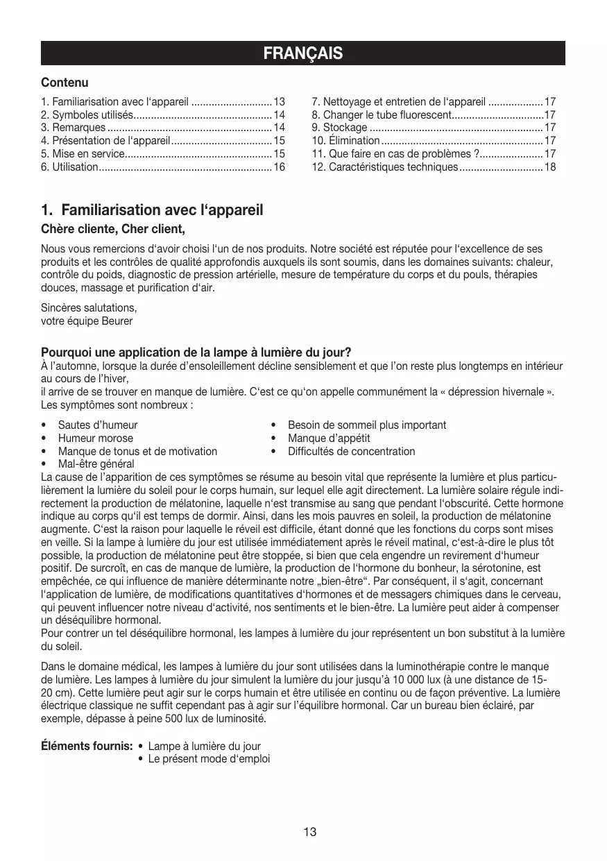 Chère cliente, Cher client, Nous vous remercions d‘avoir choisi l‘un de nos produits. Notre société est réputée pour l‘excellence de ses produits et les contrôles de qualité approfondis auxquels ils sont soumis, dans les domaines suivants: chaleur, contrôle du poids, diagnostic de pression artérielle, mesure de température du corps et du pouls, thérapies douces, massage et purification d‘air. Sincères salutations, votre équipe Beurer Pourquoi une application de la lampe à lumière du jour? À l’automne, lorsque la durée d’ensoleillement décline sensiblement et que l’on reste plus longtemps en intérieur au cours de l’hiver, il arrive de se trouver en manque de lumière. C‘est ce qu‘on appelle communément la « dépression hivernale ». Les symptômes sont nombreux :