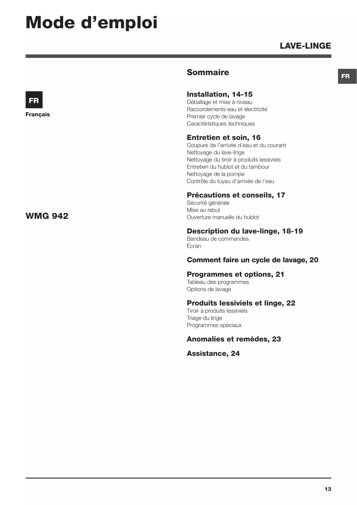 WMG942 - Lave-linge HOTPOINT - Notice d'utilisation et mode d'emploi gratuit