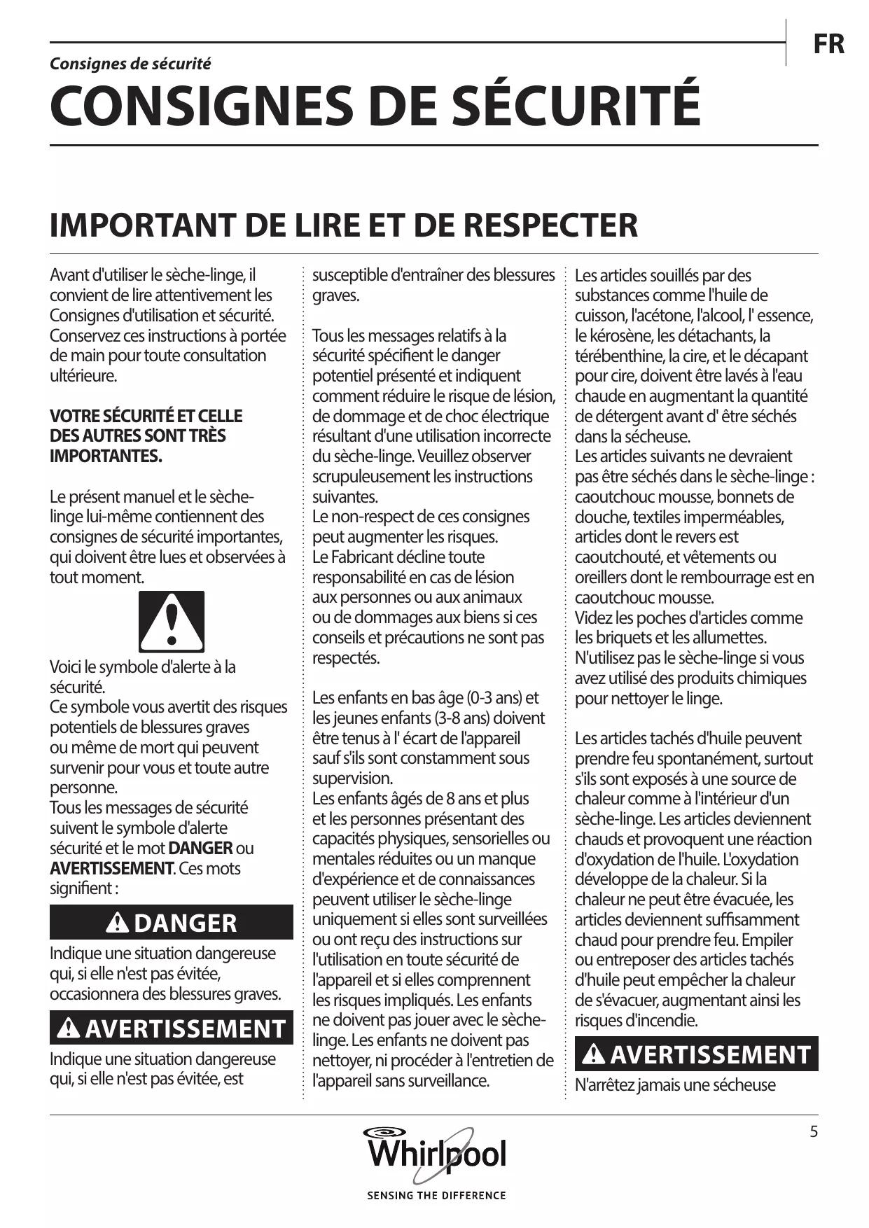 Tous les messages relatifs à la sécurité spécifique le danger potentielprésenté et indiquent comment réduire le risque de lésion, de dommage et de chic électrique résultat d'une utilisation incorrecte du sèche-linge. Veuillez observer scrupuleusement les instructions suivantes.